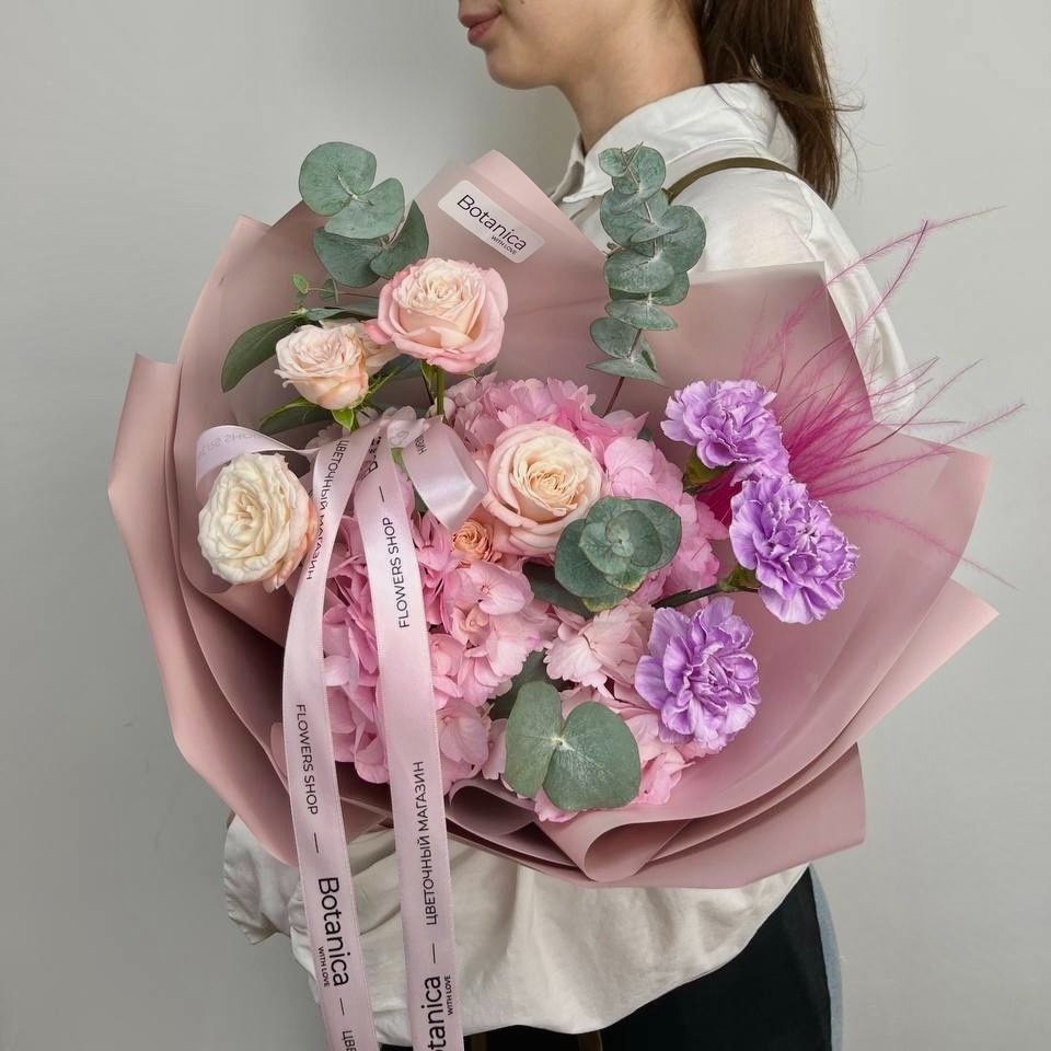Этот акварельный букет с гортензией и пионовидной розой