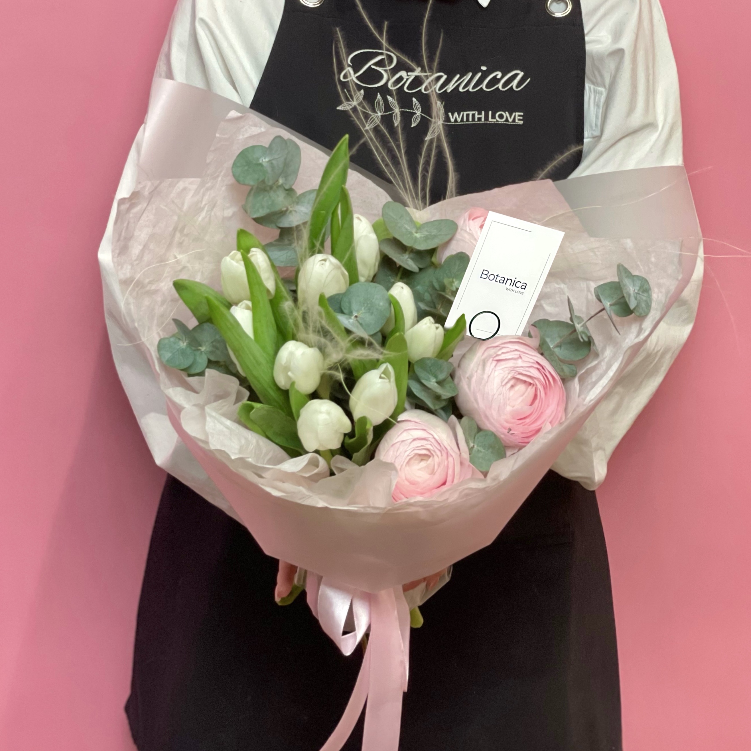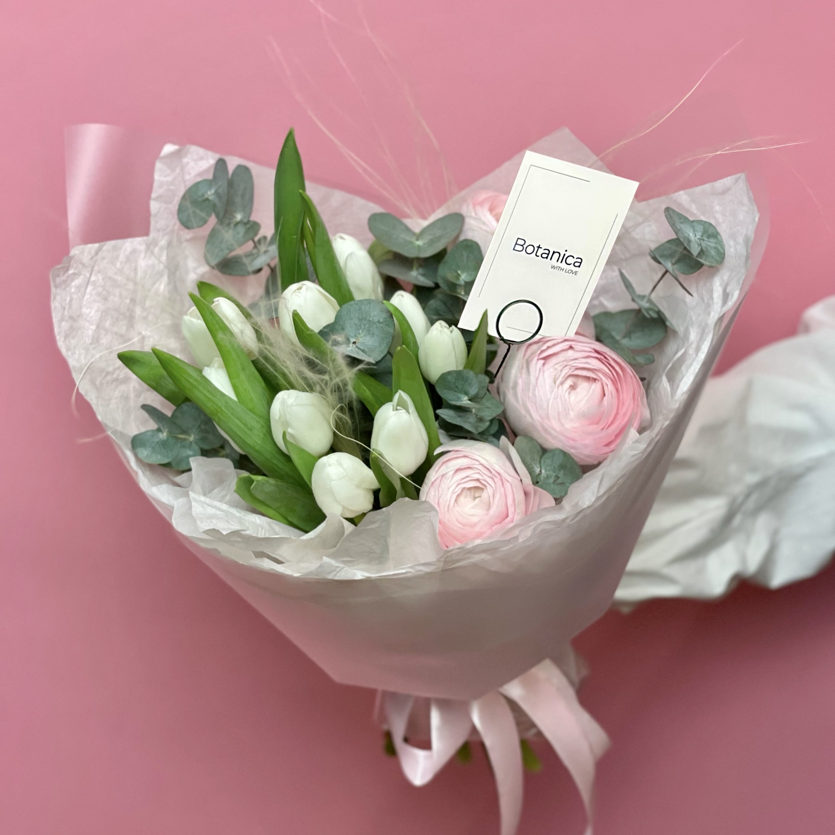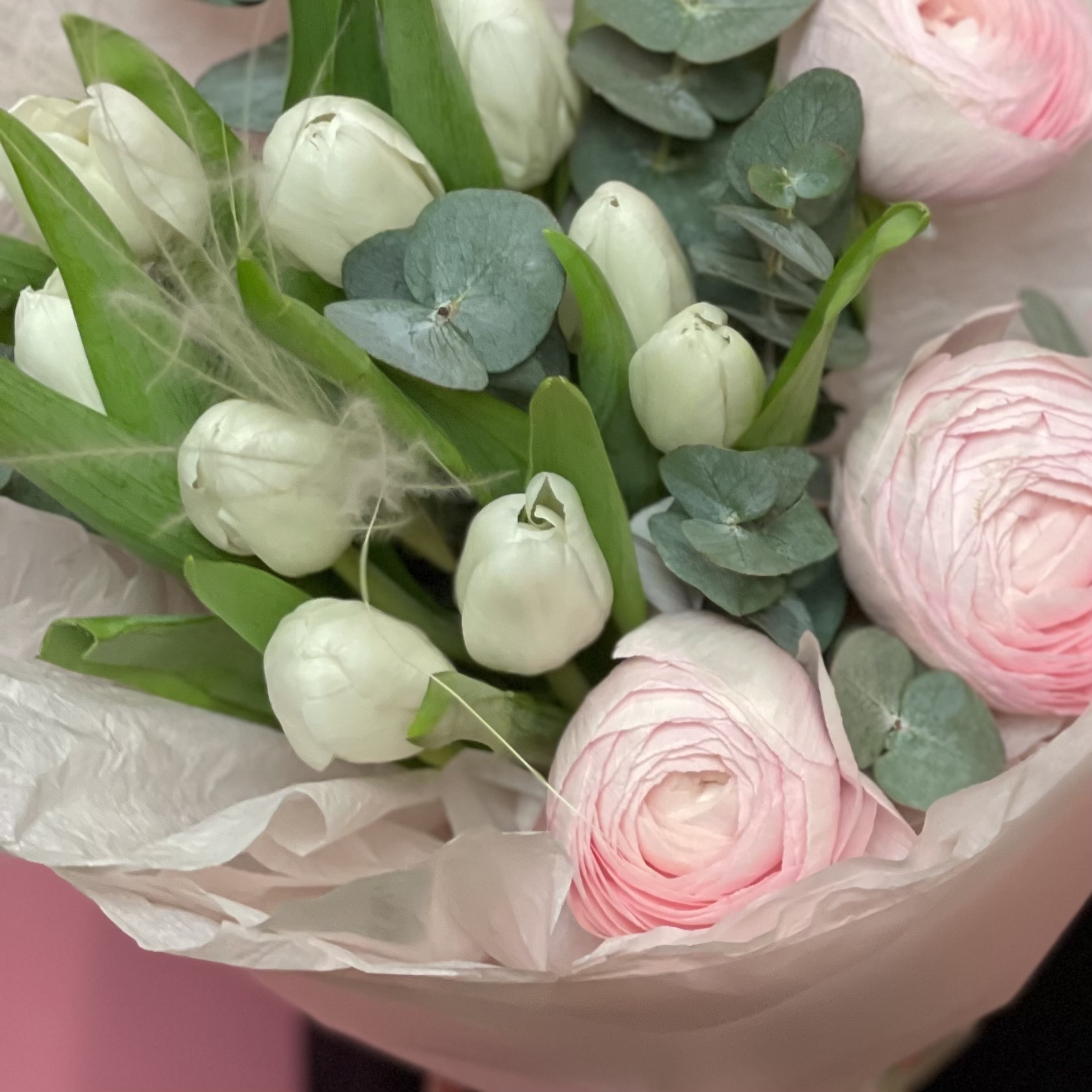 Авторский букет — нежное сплетение трёх ранункулусов в сверкающем розово-винном оттенке, окружённых чистыми белыми тюльпанами, словно лёгкий шёпот весенней росы. Вдобавок добавлена свежая зелень эвкалипта, наполняющая воздух лёгким ароматом и создающая гармоничную симфонию красоты и изящества.
