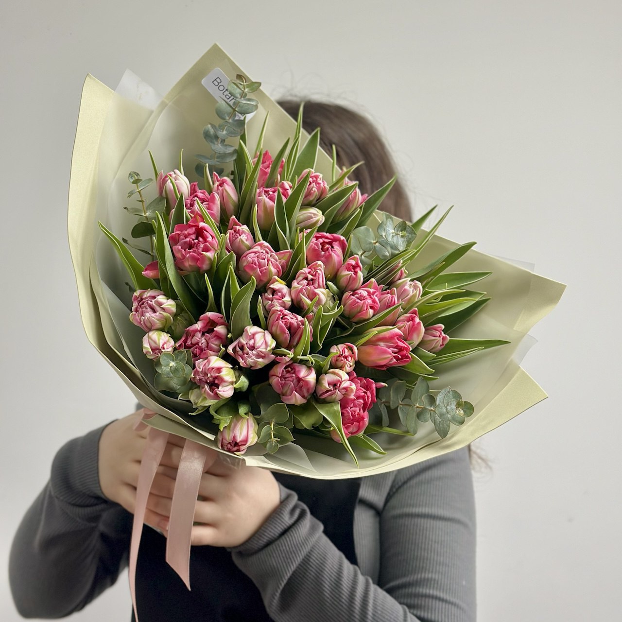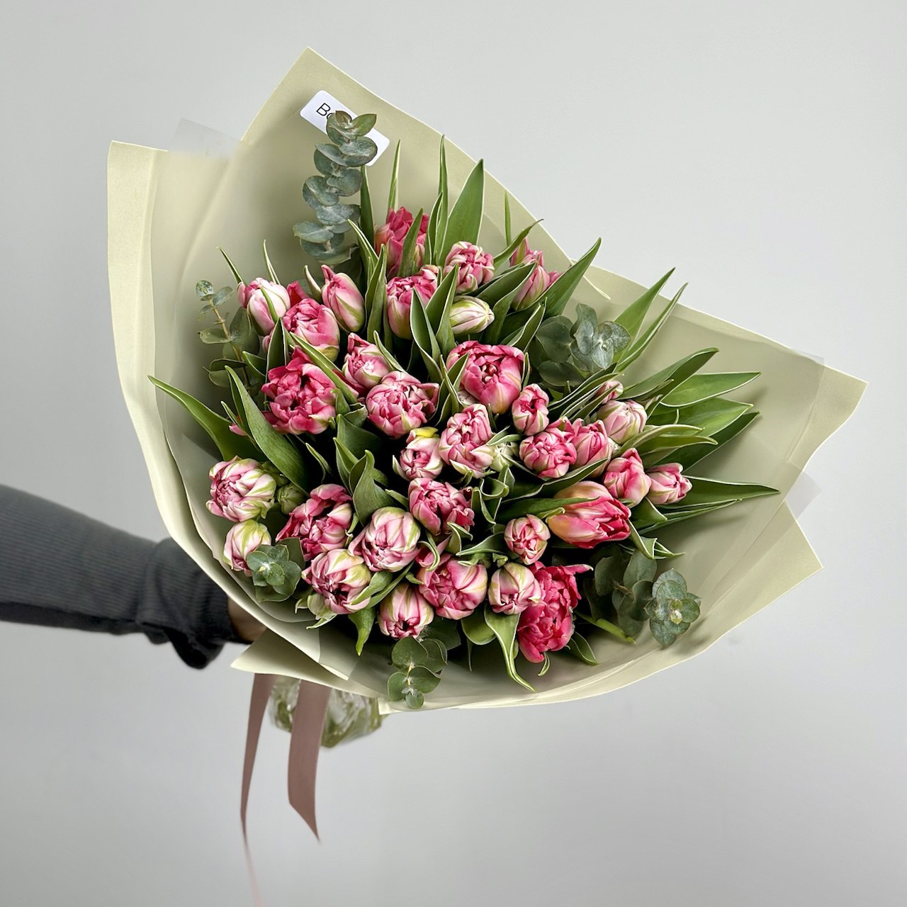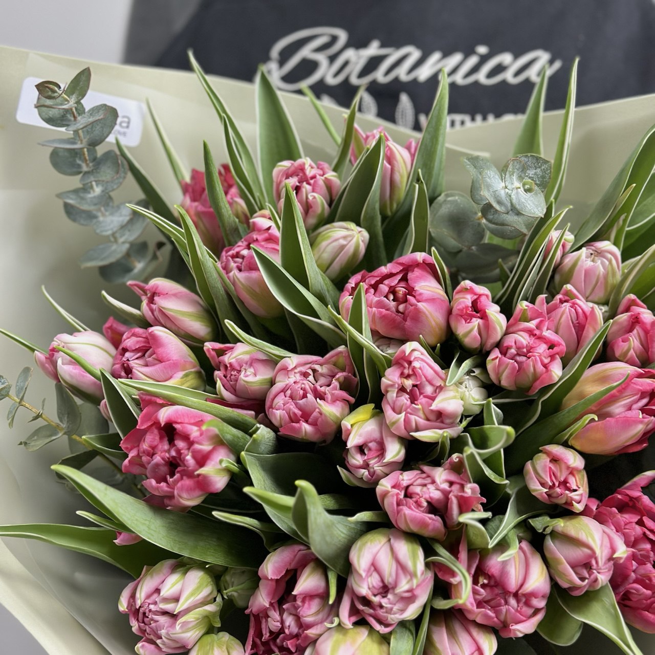 Состав: тюльпаны пионовидные Флеш поинт, эвкалипт, упаковка.