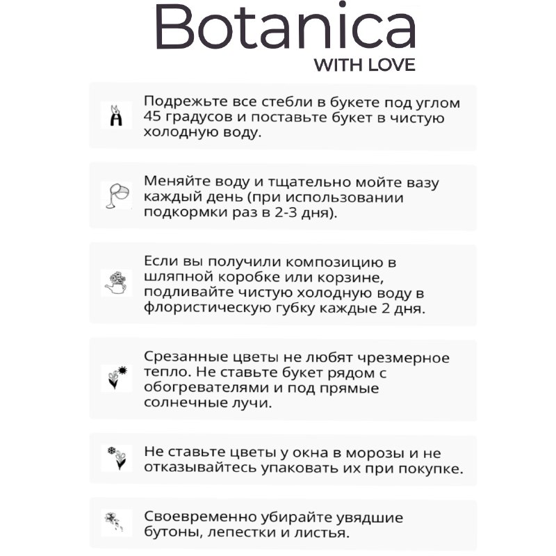 Дополнительно к каждому букету: открытка, транспортировочная упаковка, подкормка, инструкция по уходу