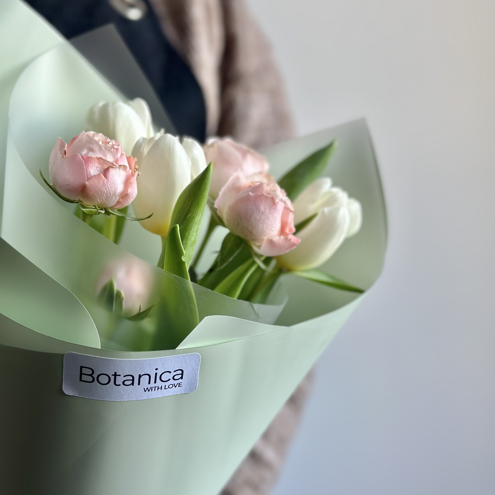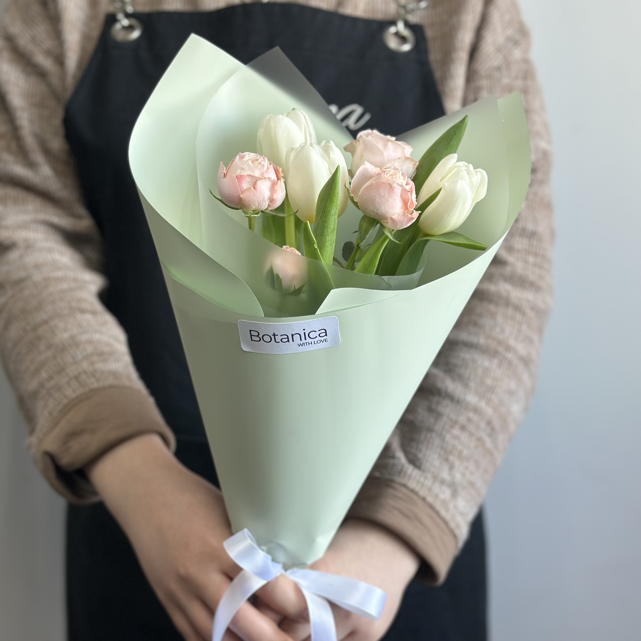 Состав: кустовая пионовидная Роза «Бомбастик», тюльпан белый, упаковка