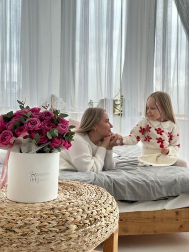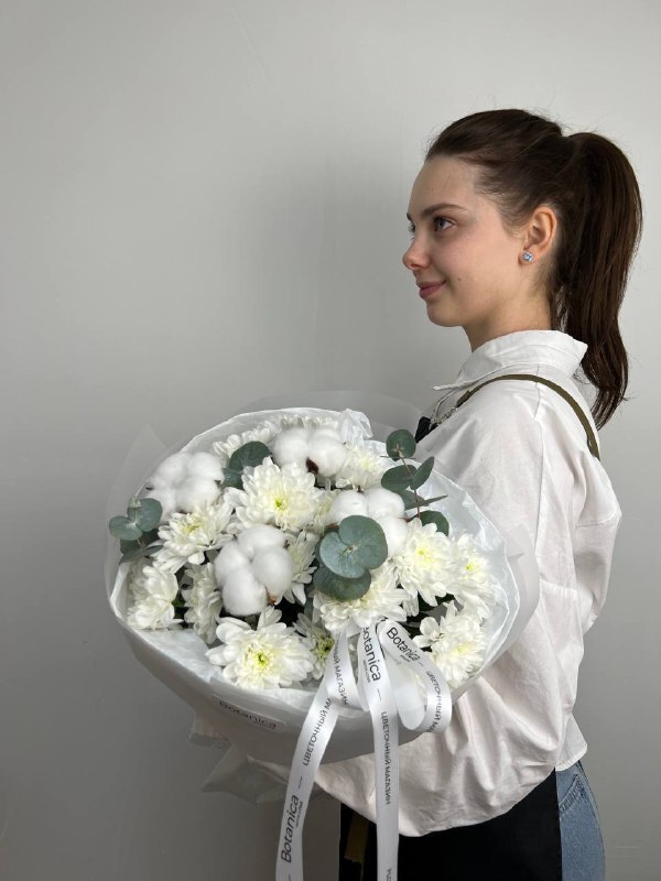 Состав: хризантема кустовая Балтика, хлопок, эвкалипт, упаковка.