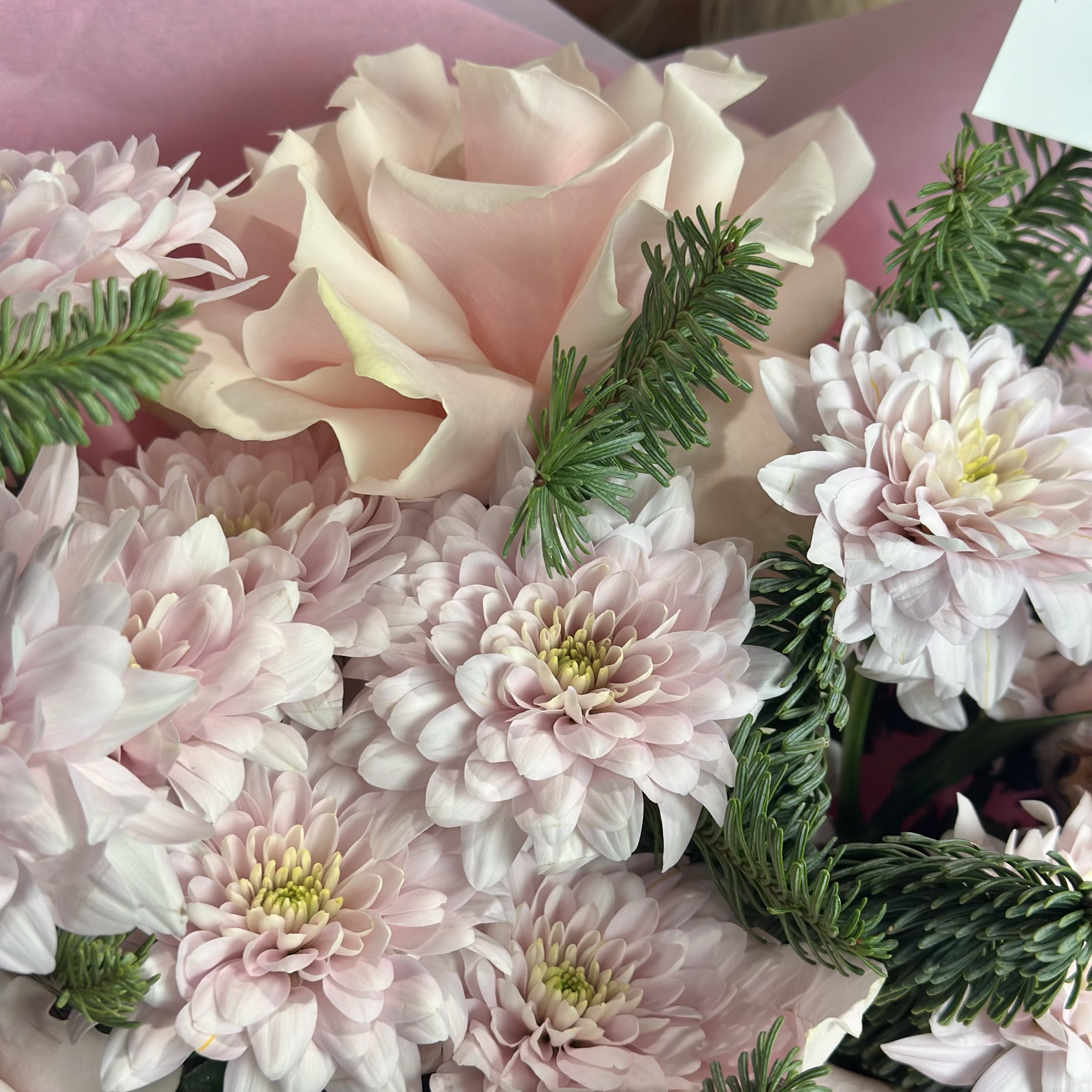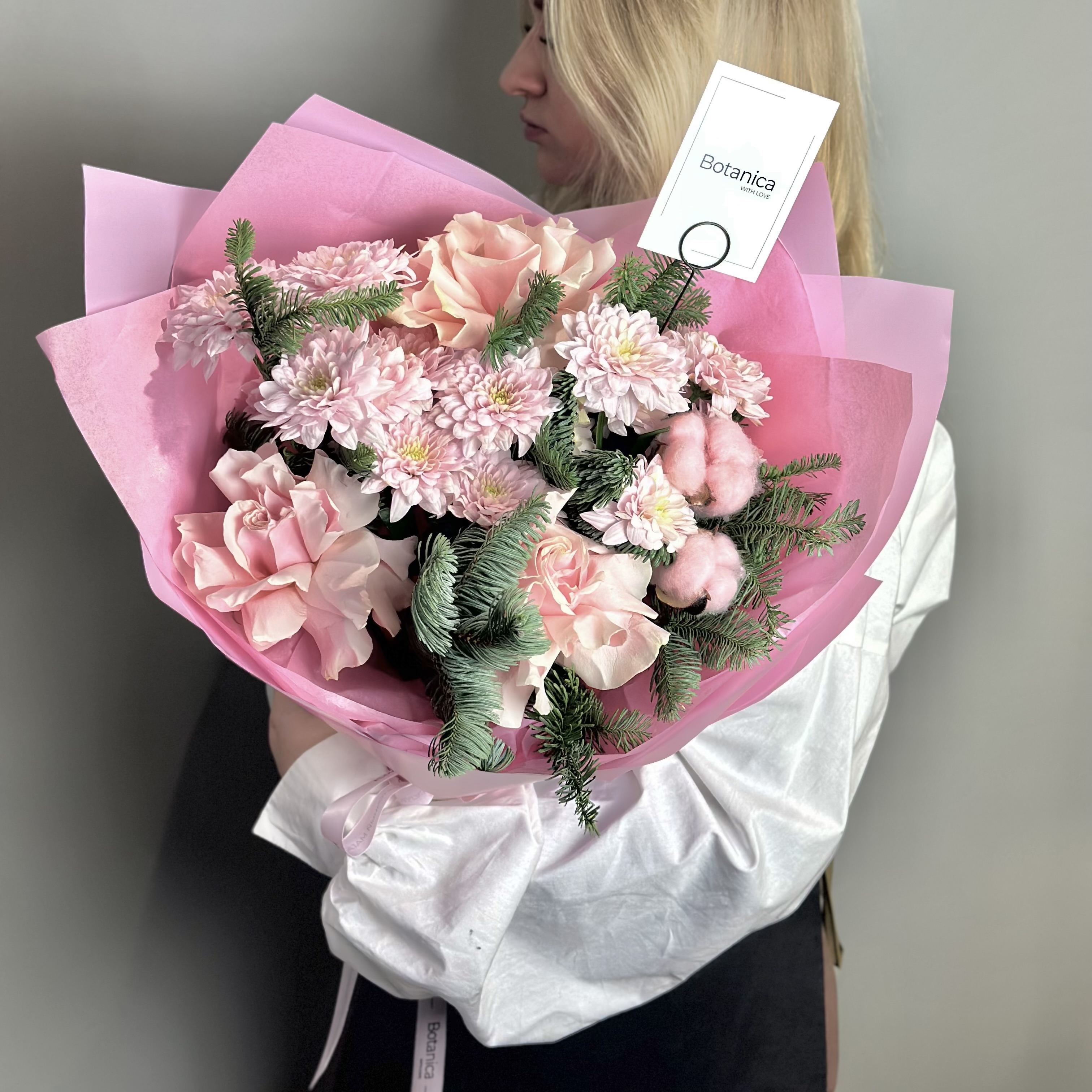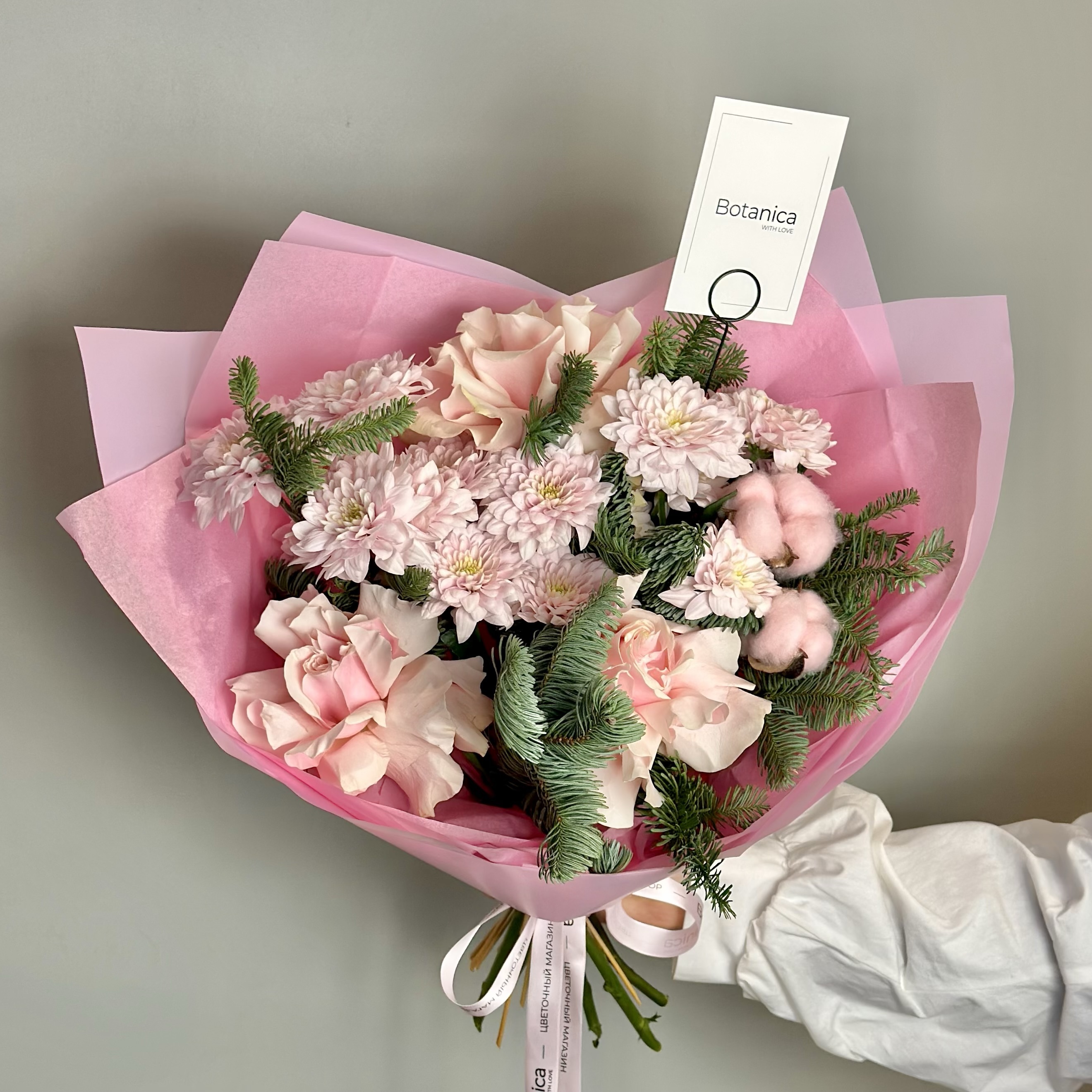 Розовая тишью , розовая матовая пленка , нежно розовая брендированная лента. Французская розовая Роза 3, хризантема Балтика розовая 3, розовый хлопок 2, нобилис 1 ветка