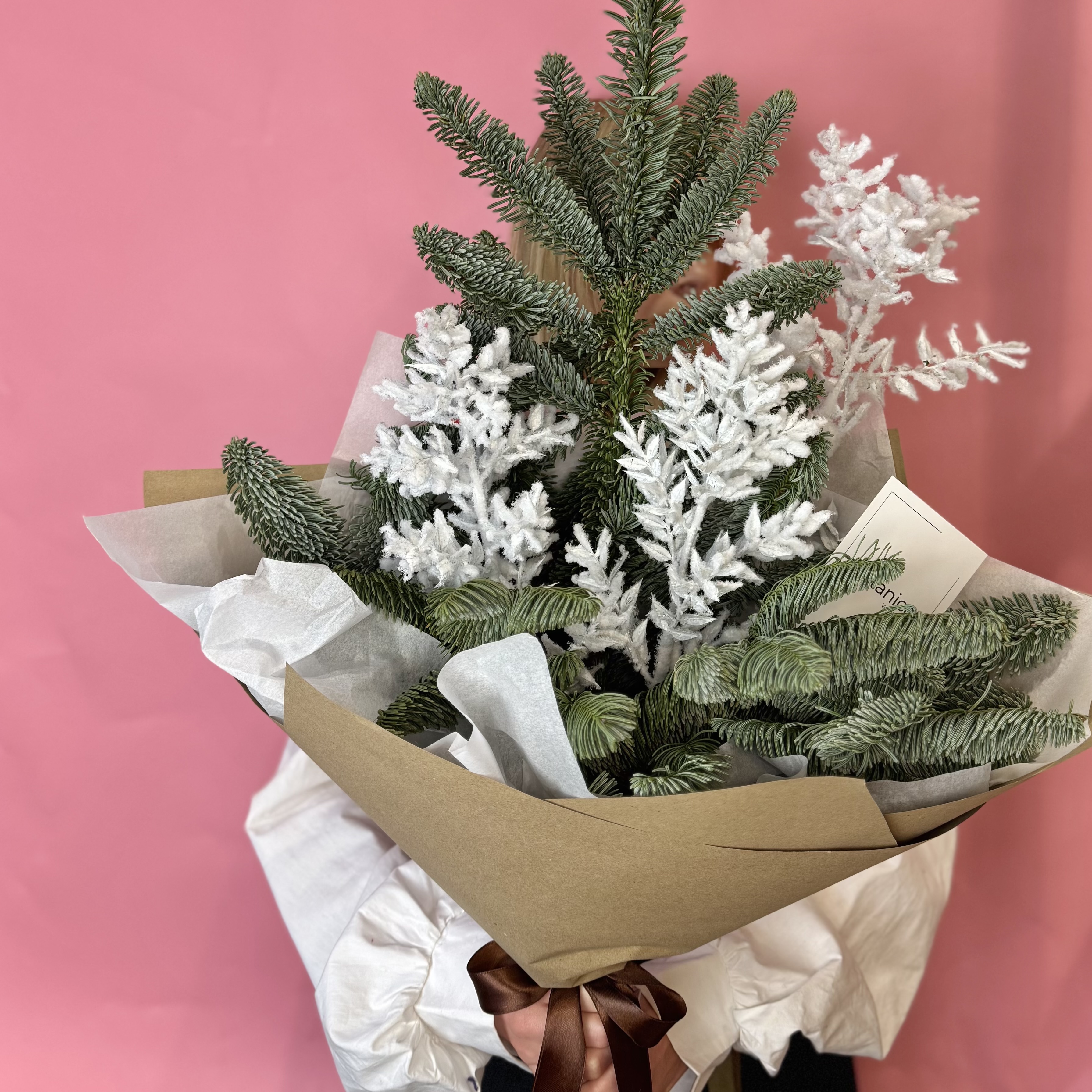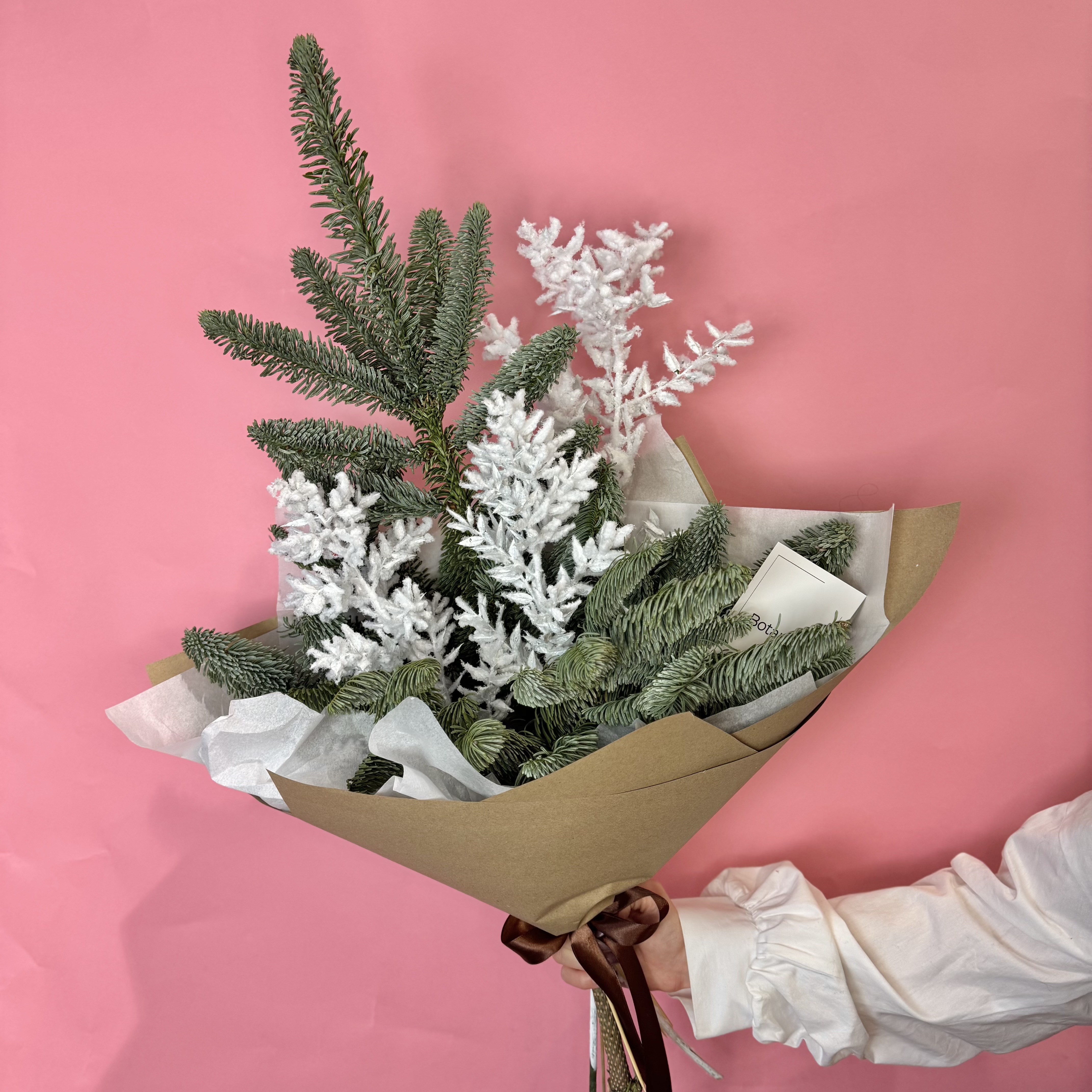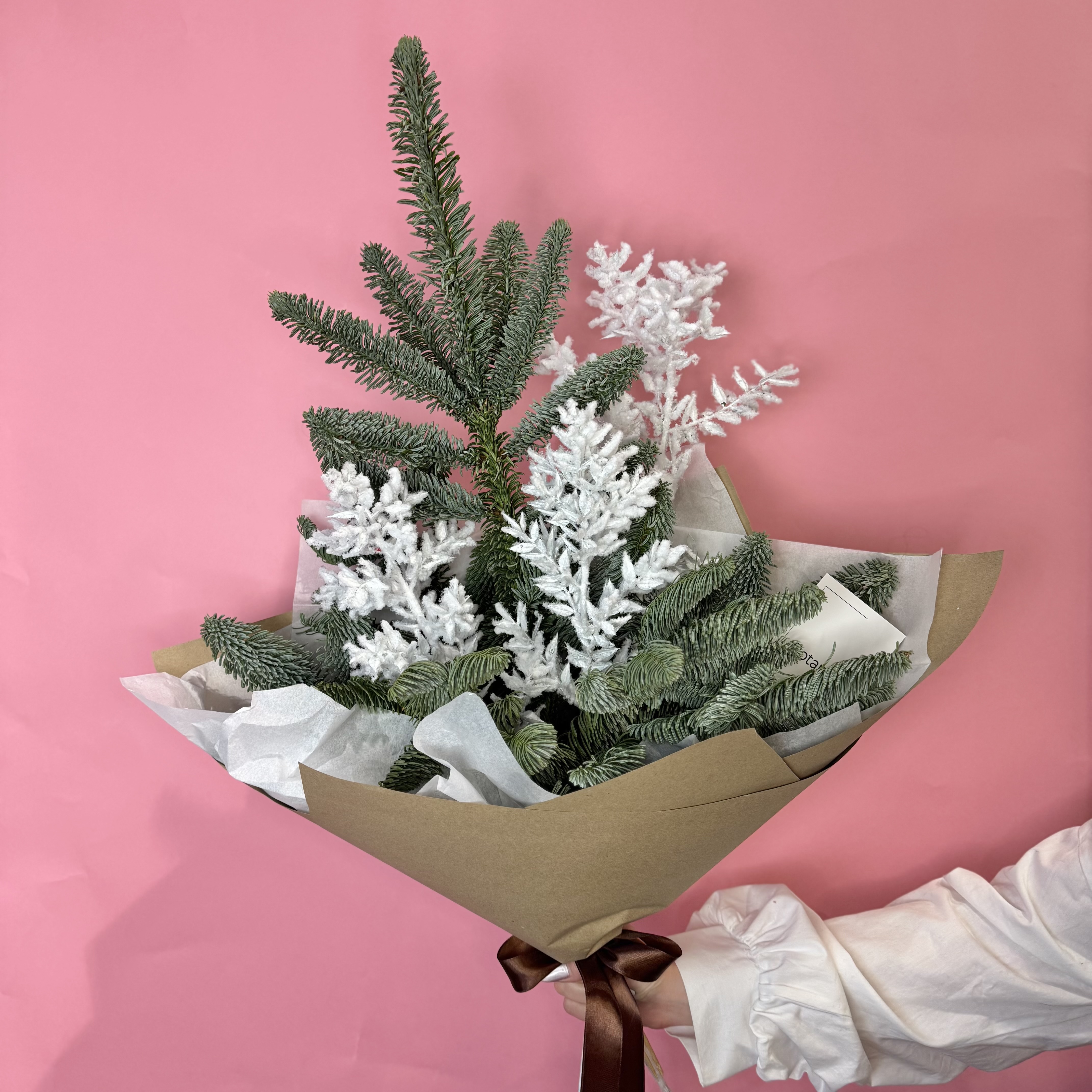 Букет с нобилисом и заснеженным рускусом — это элегантная зимняя композиция. В центре расположены цветы нобилиса с яркими, насыщенными цветами, окружённые заснеженными веточками рускуса, покрытыми искусственным снегом. Такой букет выглядит свежо и празднично, создавая атмосферу зимней сказки.