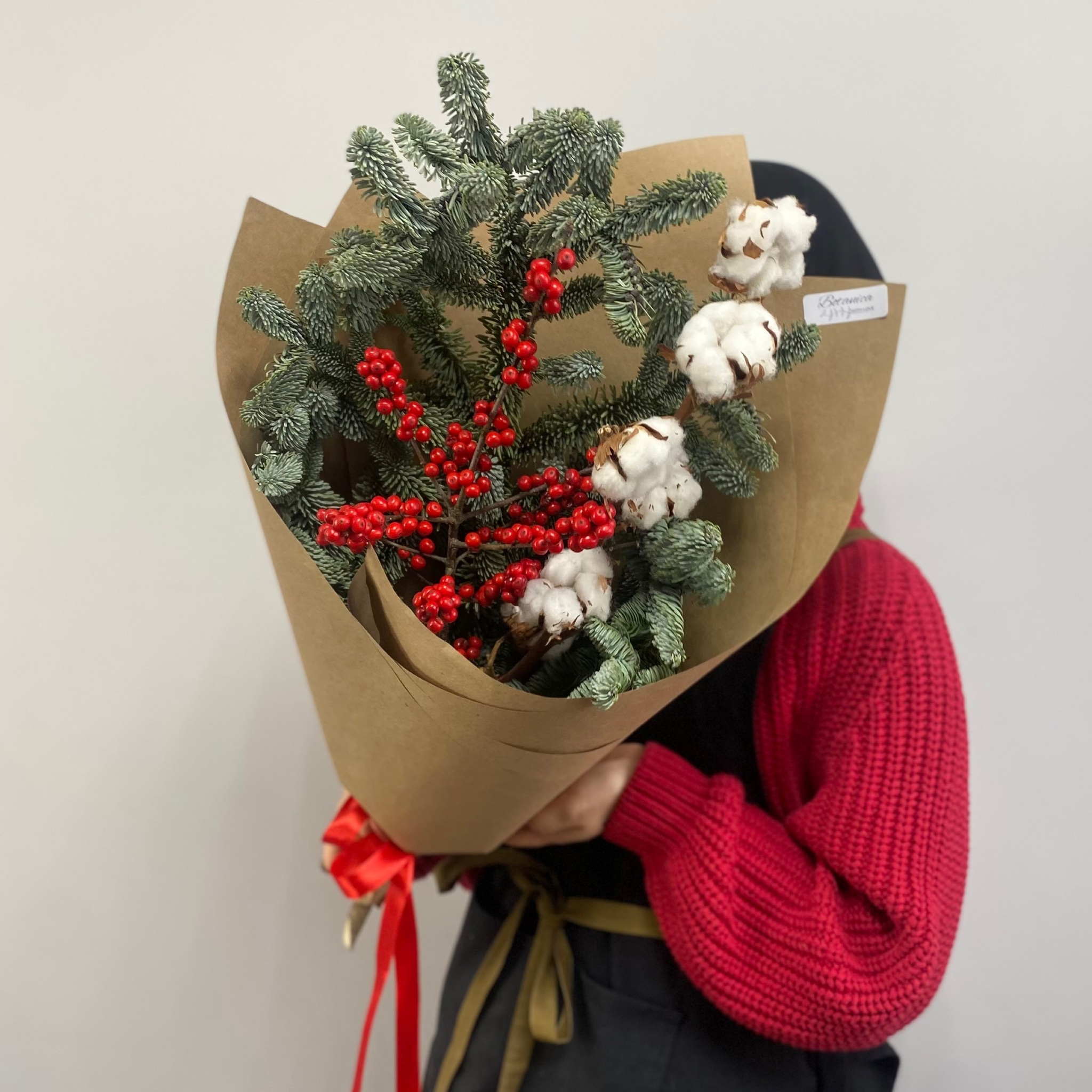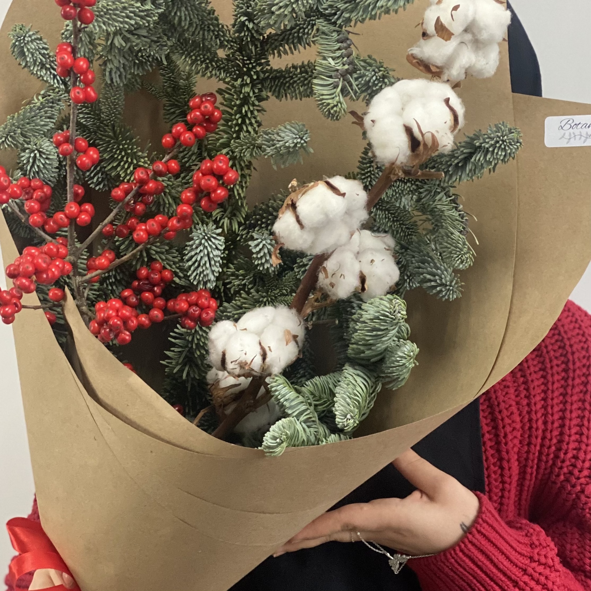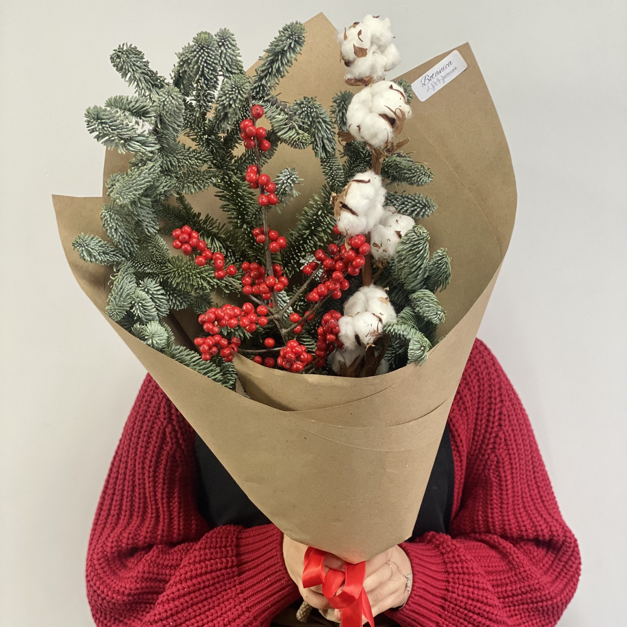Букет с нобилисом, илексом и хлопком в крафте 1057