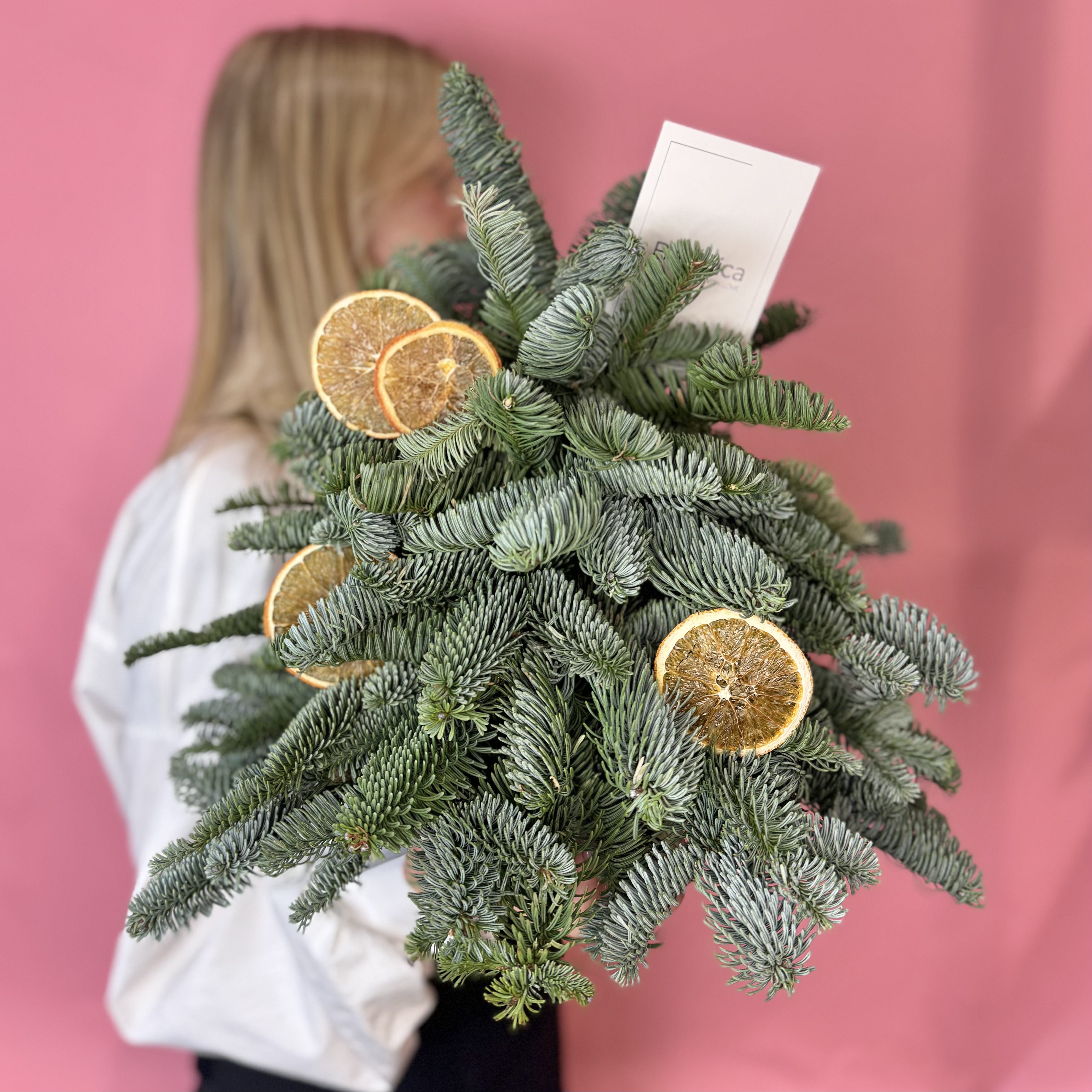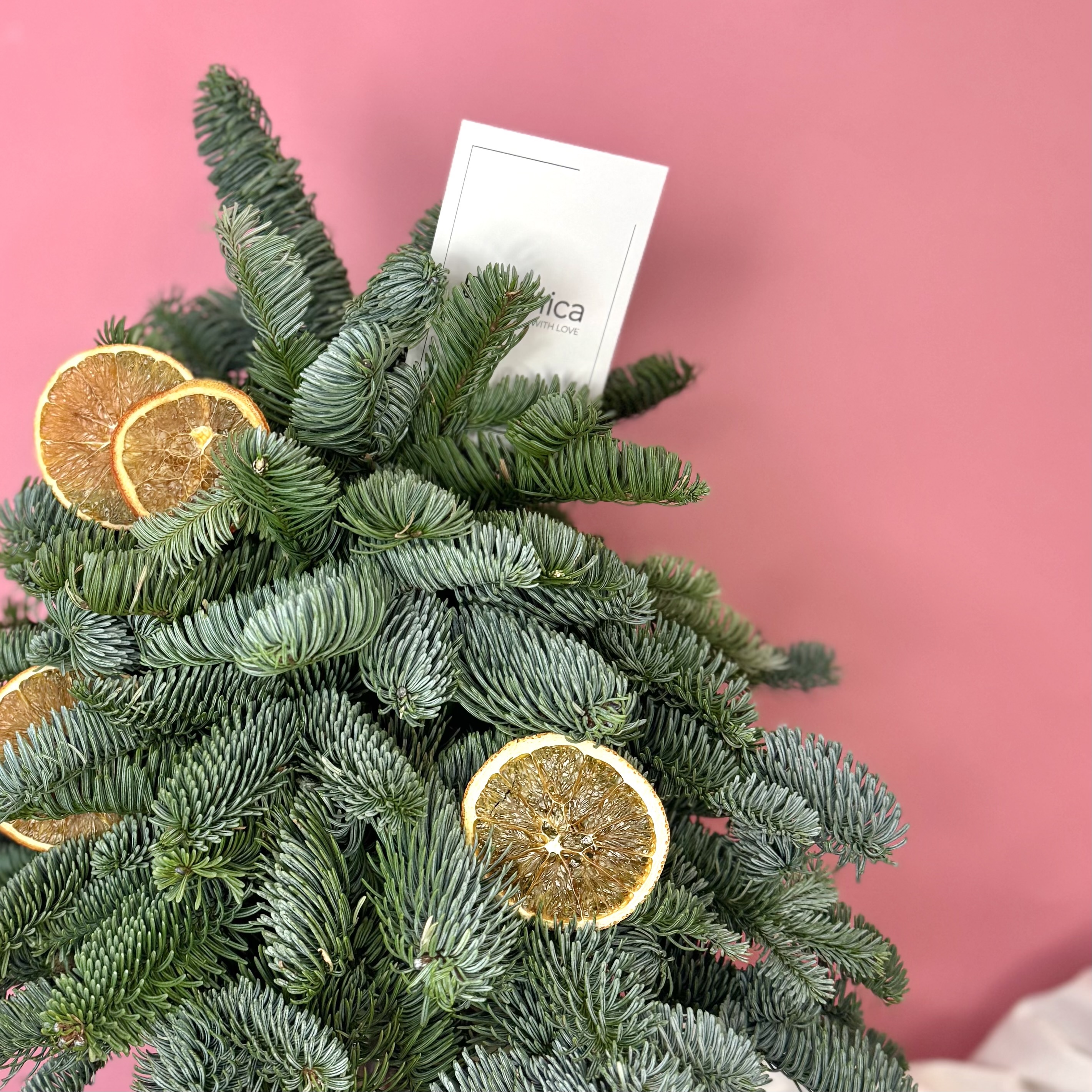 Новогодняя композиция в виде елки с сушеным апельсином — это небольшая декоративная елка, украшенная сушеными апельсиновыми кружочками. Елка может быть выполнена из зелёных веточек или искусственного материала, а сушеные апельсины разместить в виде ярких кругов по всему силуэту елки или в её верхней части. Дополнительно можно добавить коричные палочки, мелкие шары или винные ягоды для украшения. Такой дизайн создает уютную, ароматную атмосферу и наполняет дом запахом цитрусов и специй.