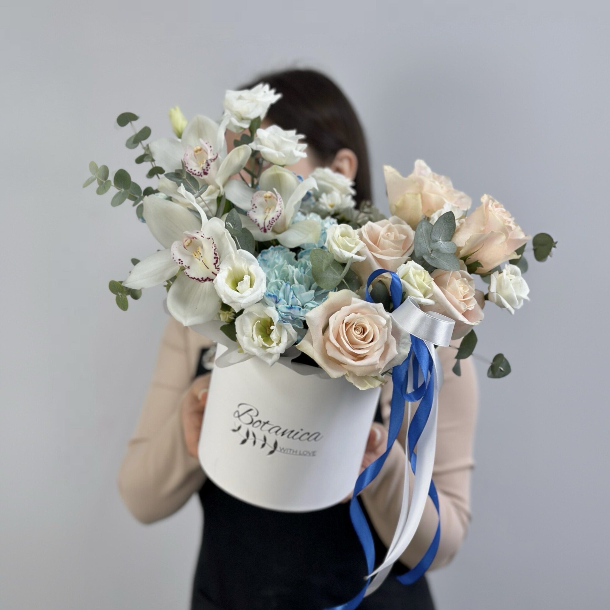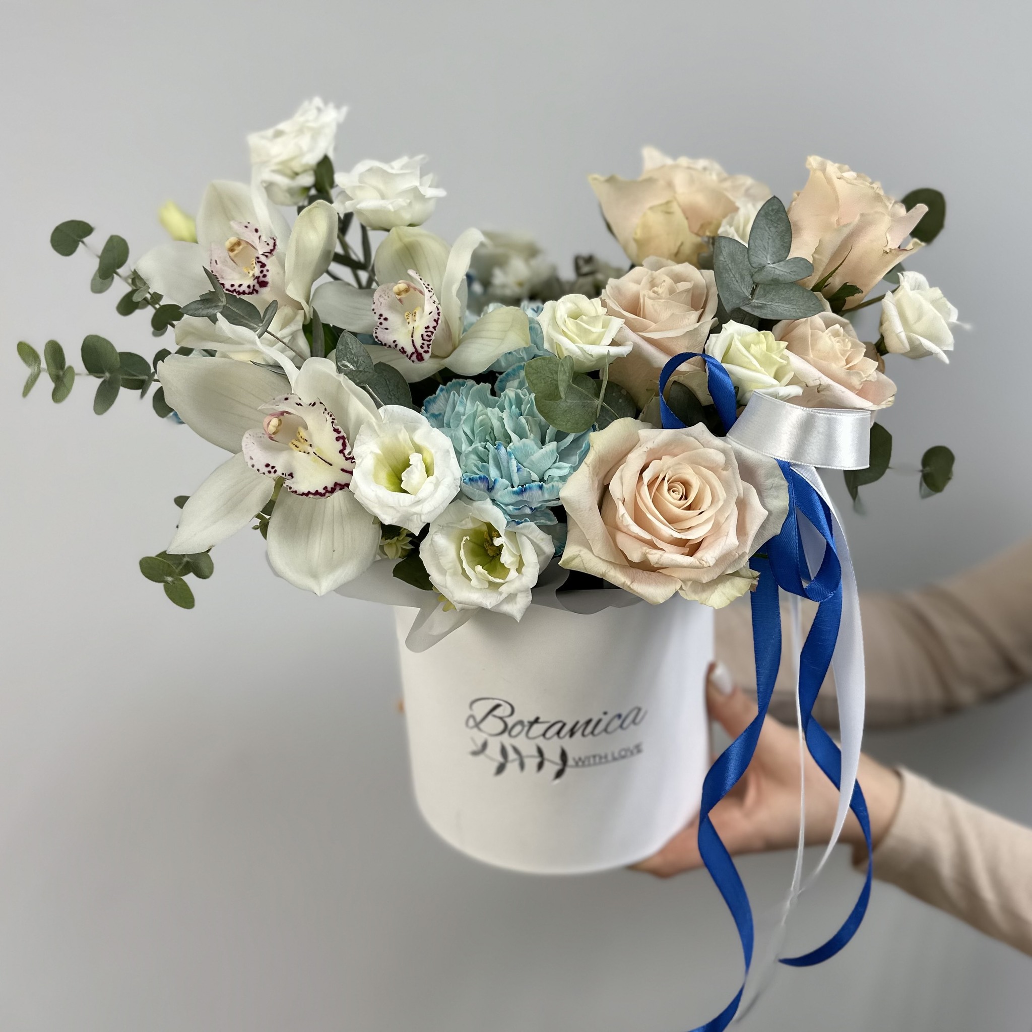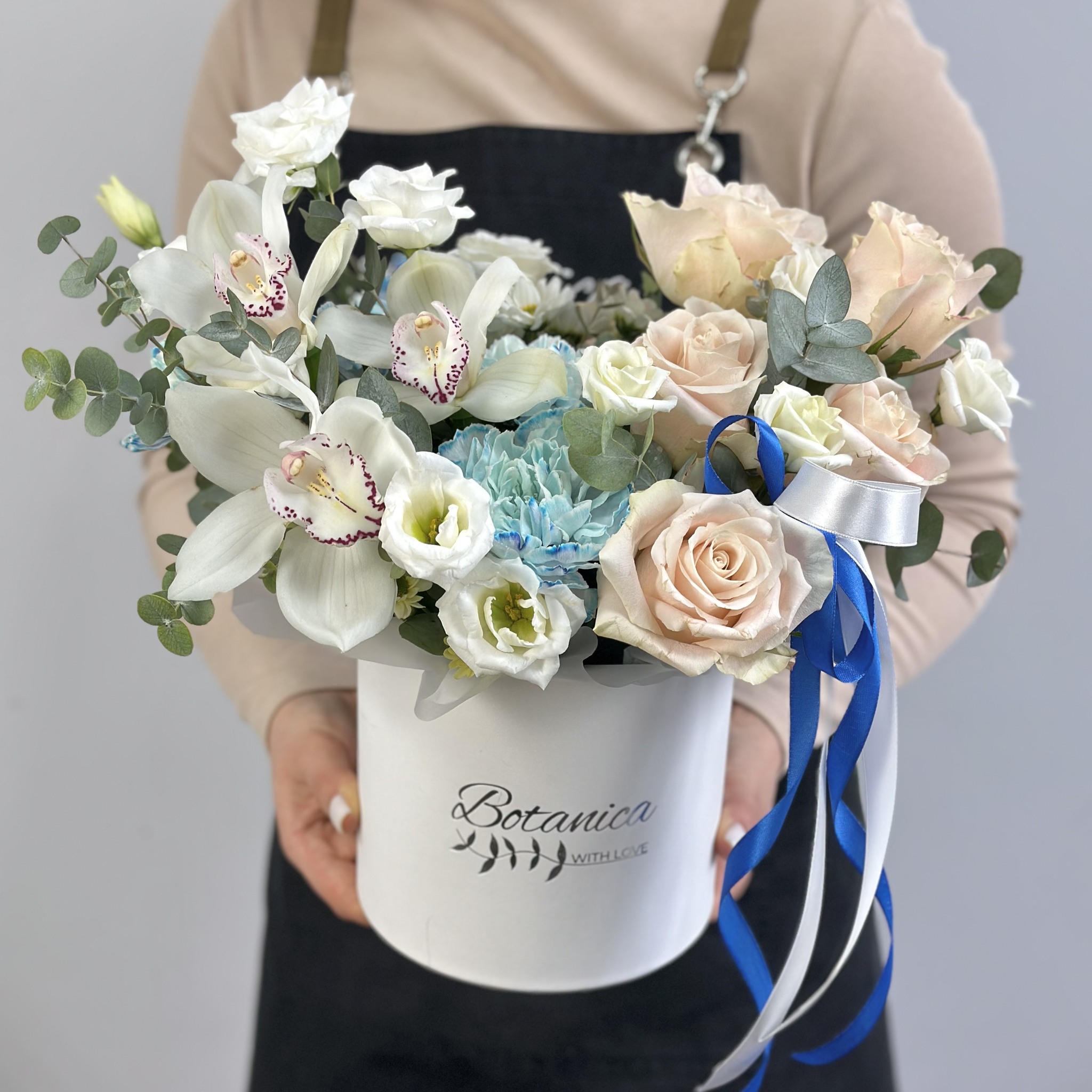 Состав: орхидеи, Роза кремовая, гвоздика, эустома белая, Сантини, эвкалипт, коробка шляпная, оазис.