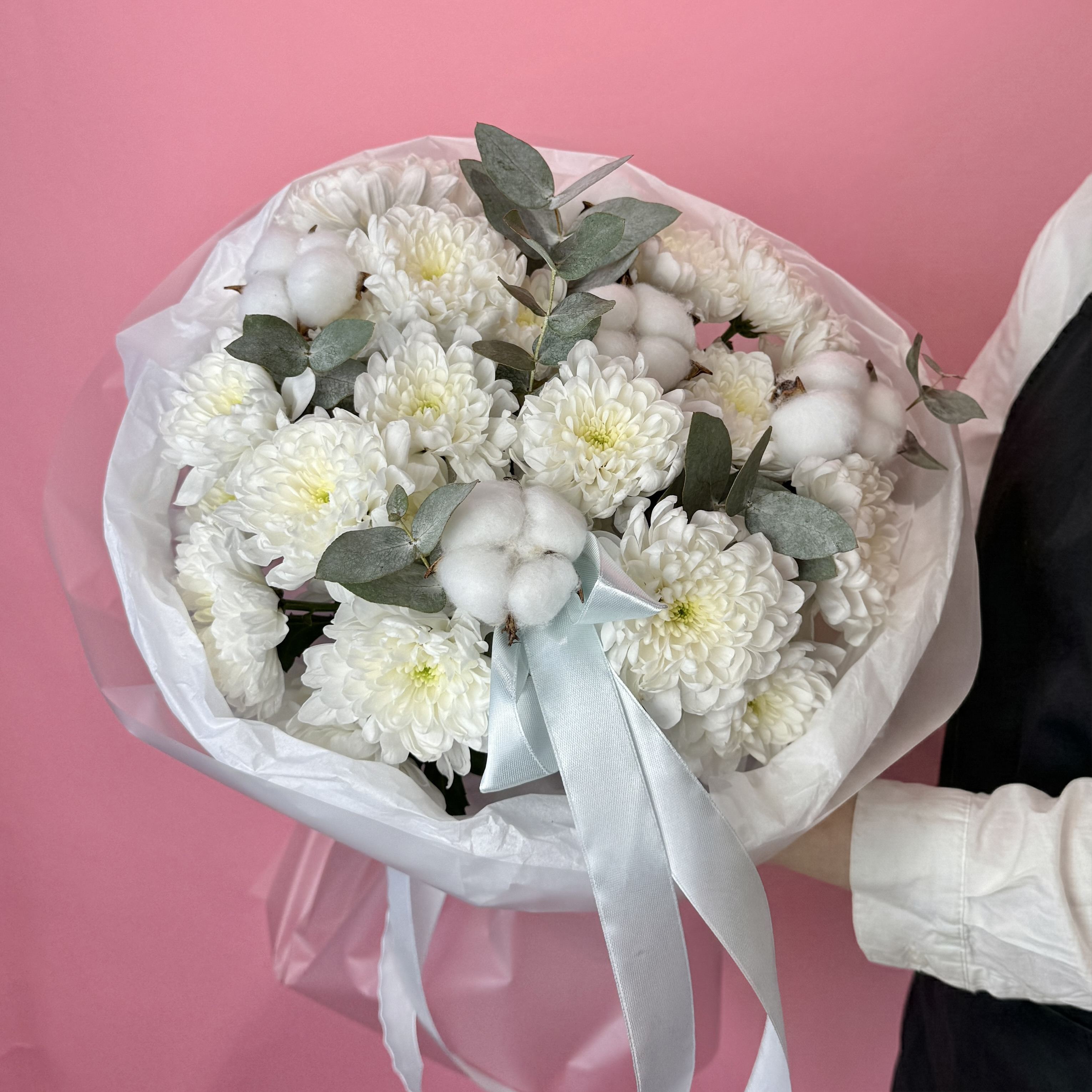 Состав: хризантема кустовая Балтика - 5 шт, хлопок-5 шт, эвкалипт, упаковка.