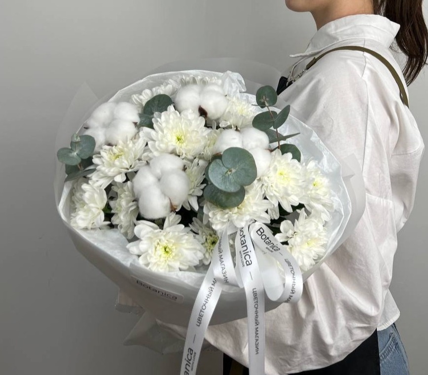 Состав: хризантема кустовая Балтика, хлопок, эвкалипт, упаковка.
