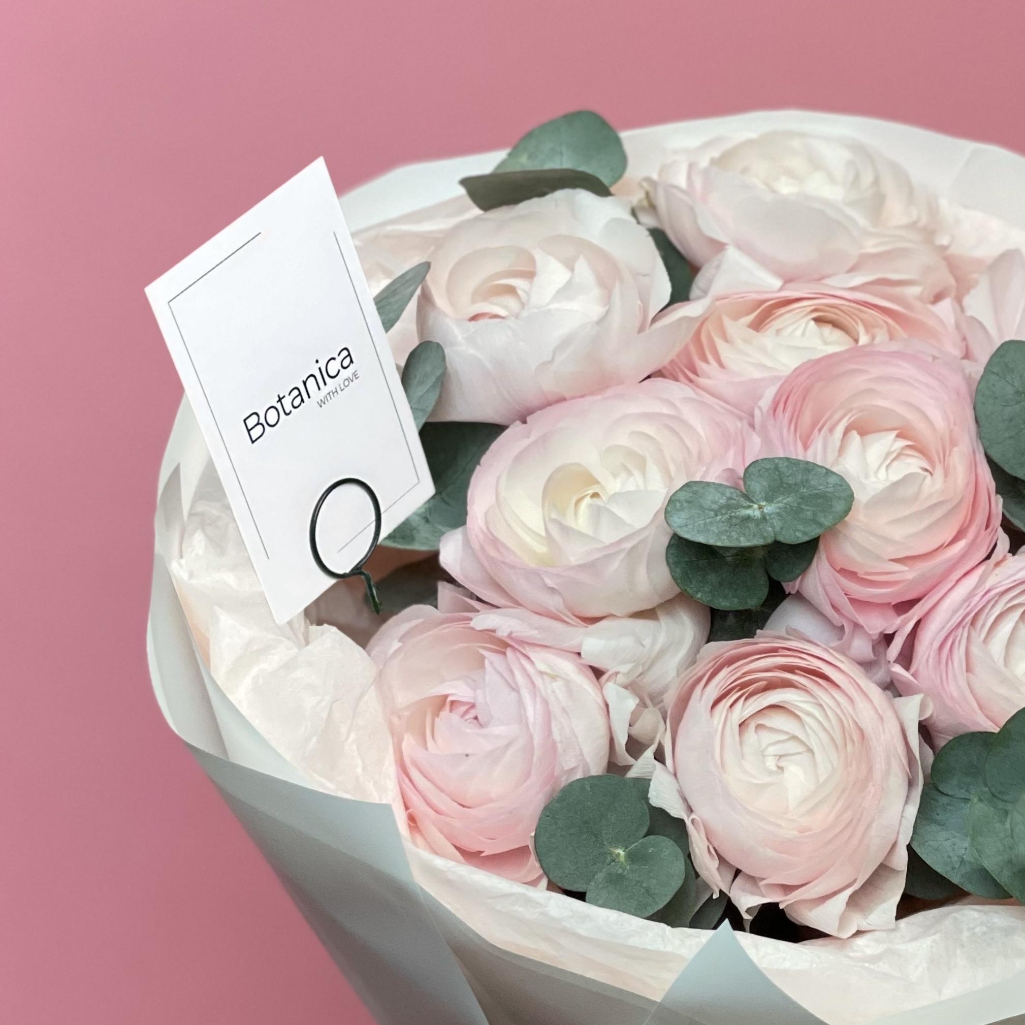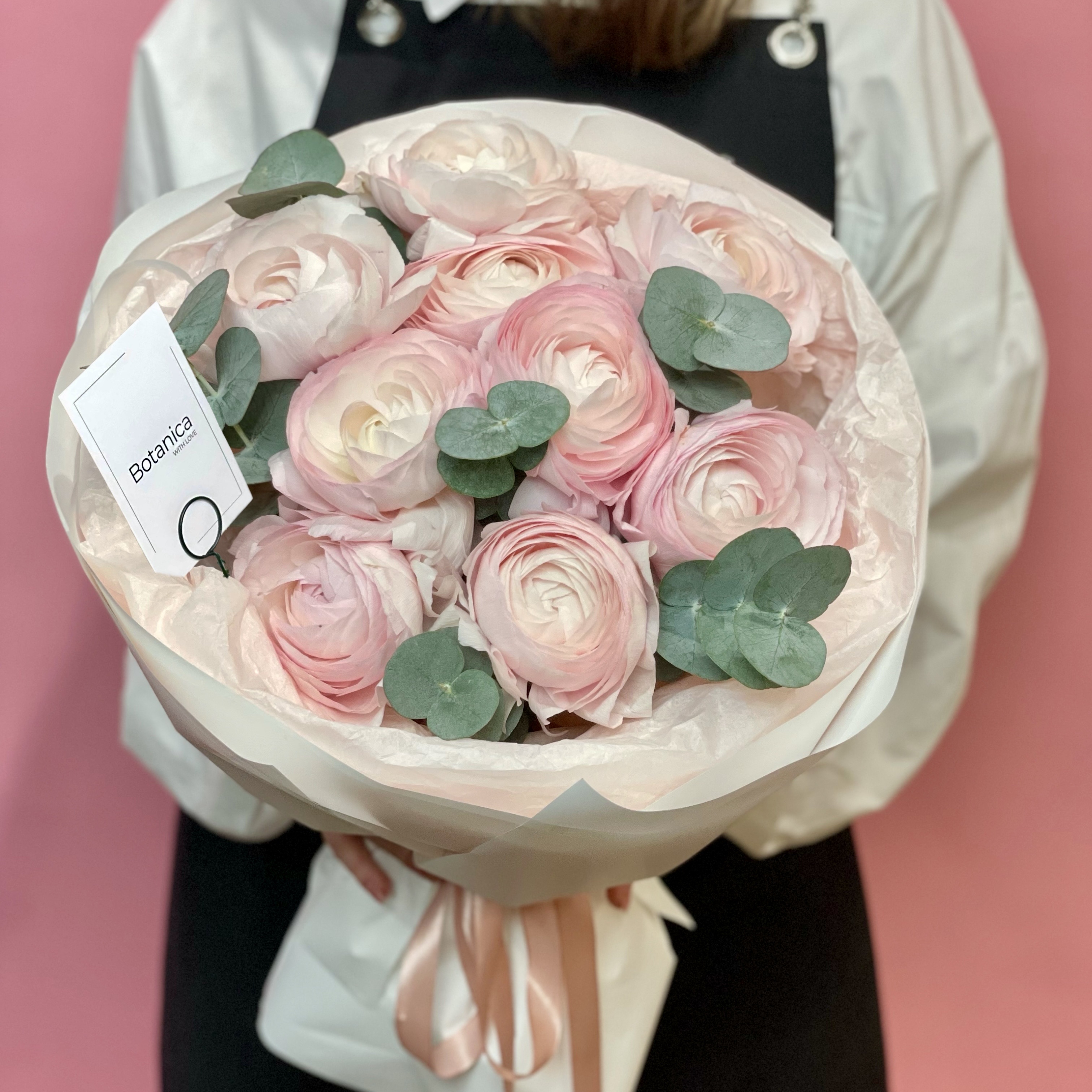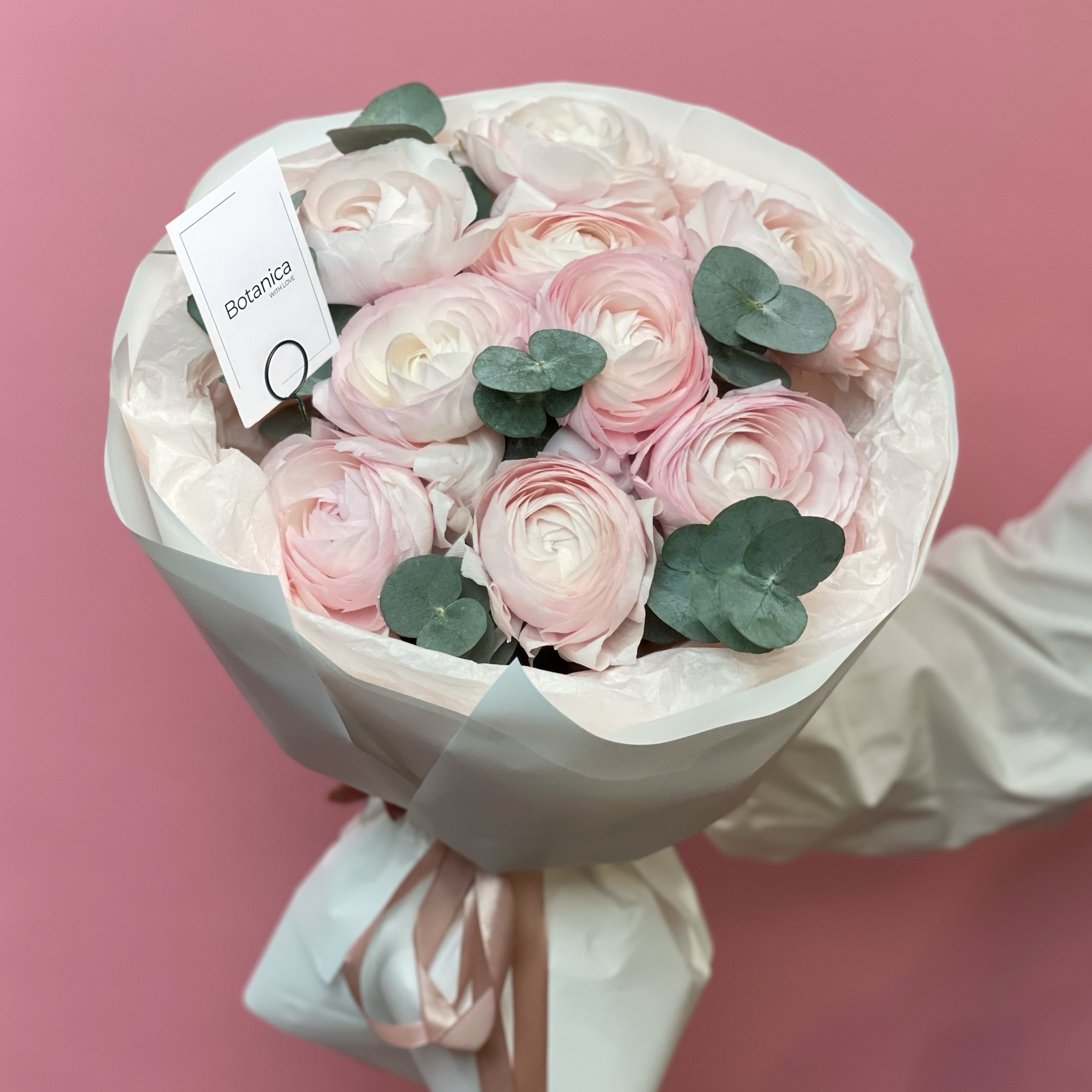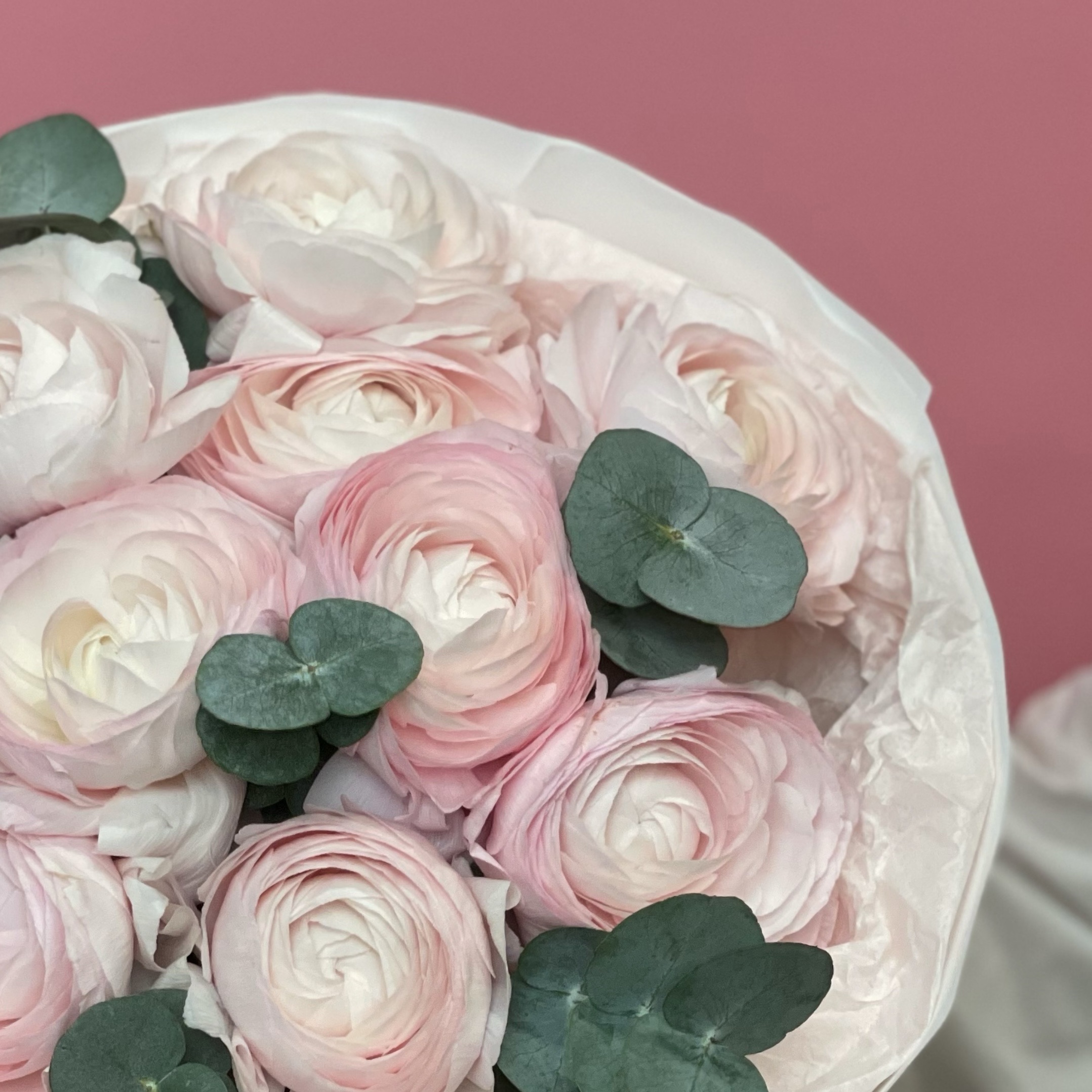 Нежный и элегантный букет из 9 ранункулусов в сочетании с ароматным эвкалиптом. Многослойные лепестки ранункулусов создают ощущение воздушности и утончённости, а эвкалипт добавляет свежесть и современный акцент. Идеально подойдёт для подарка, оформления интерьера или особого повода.