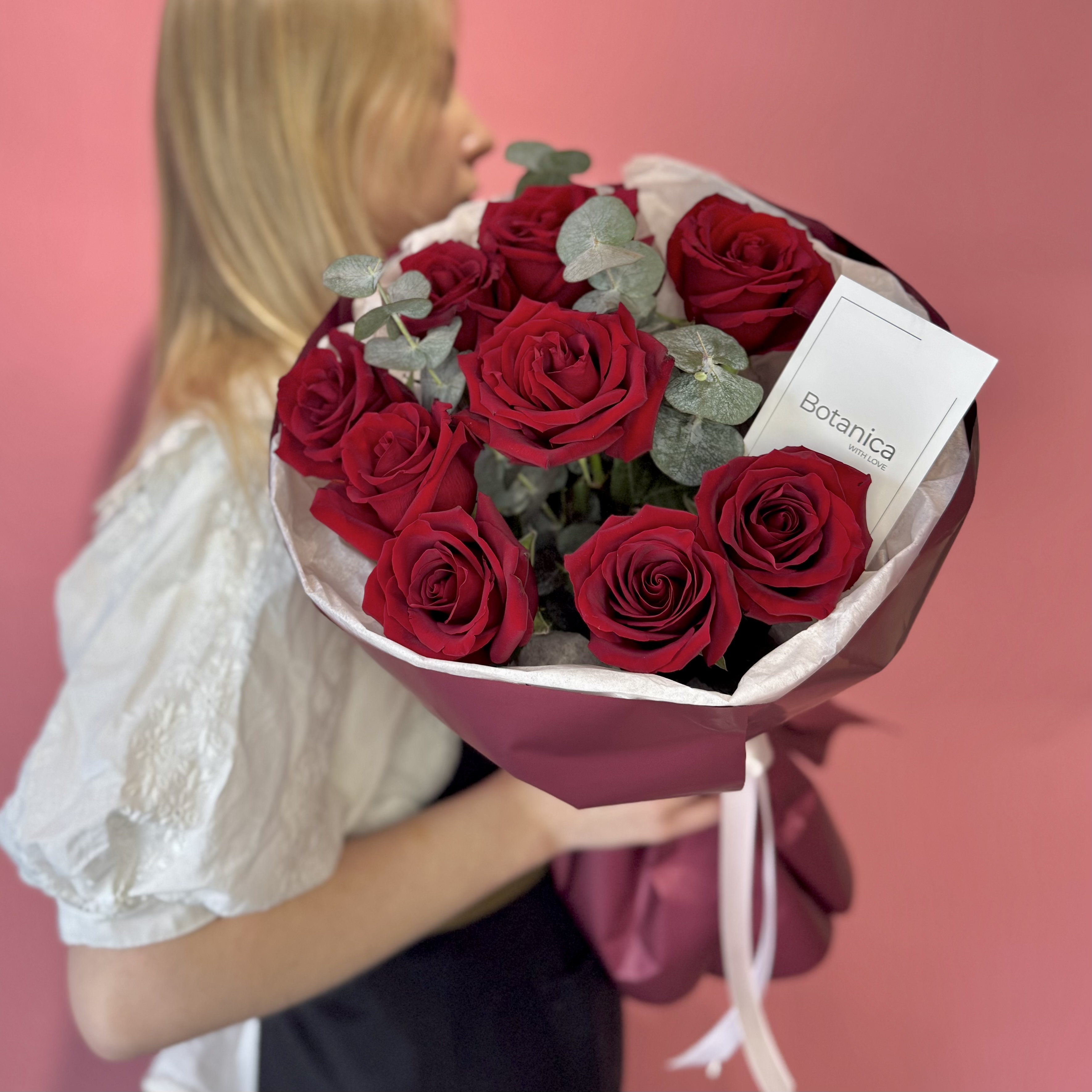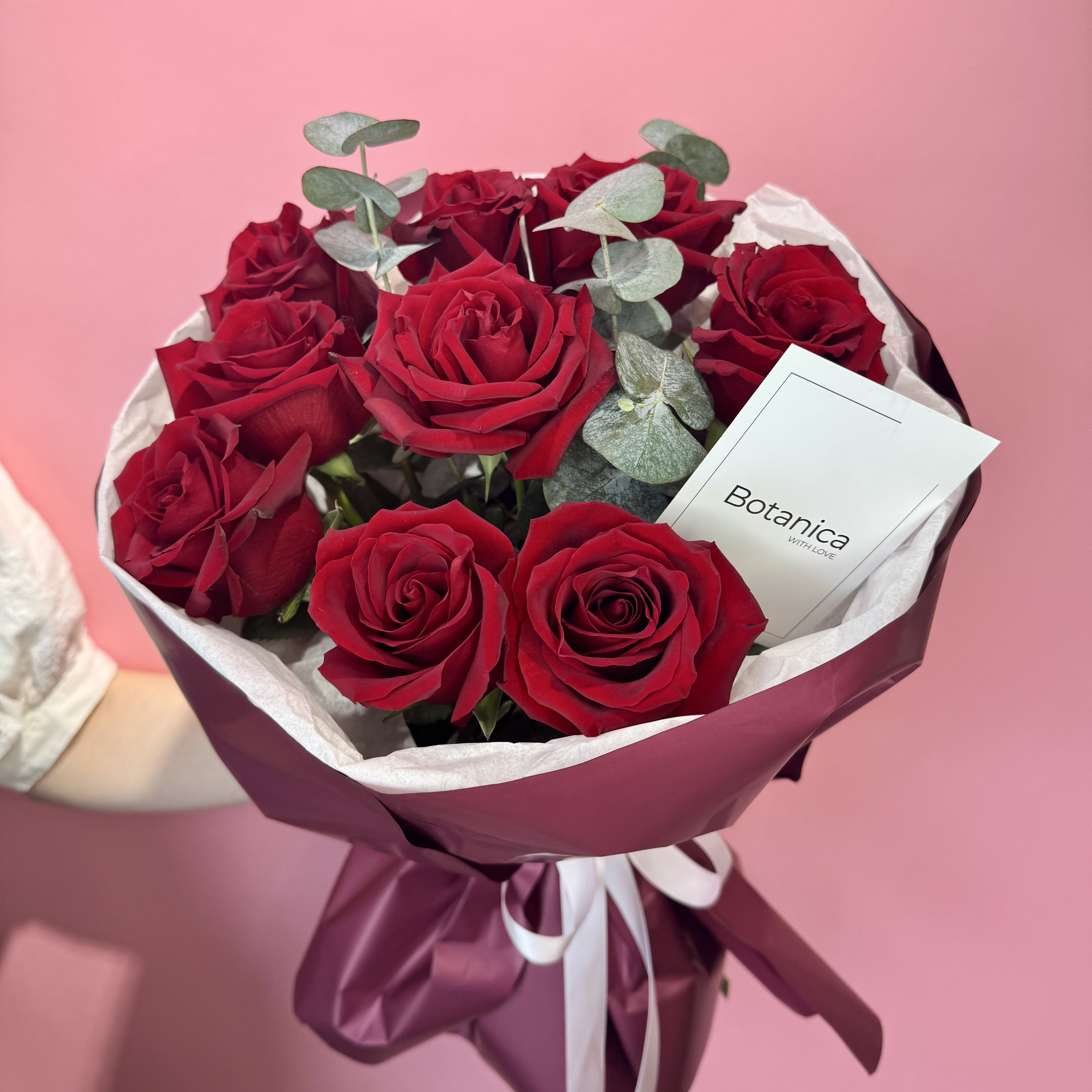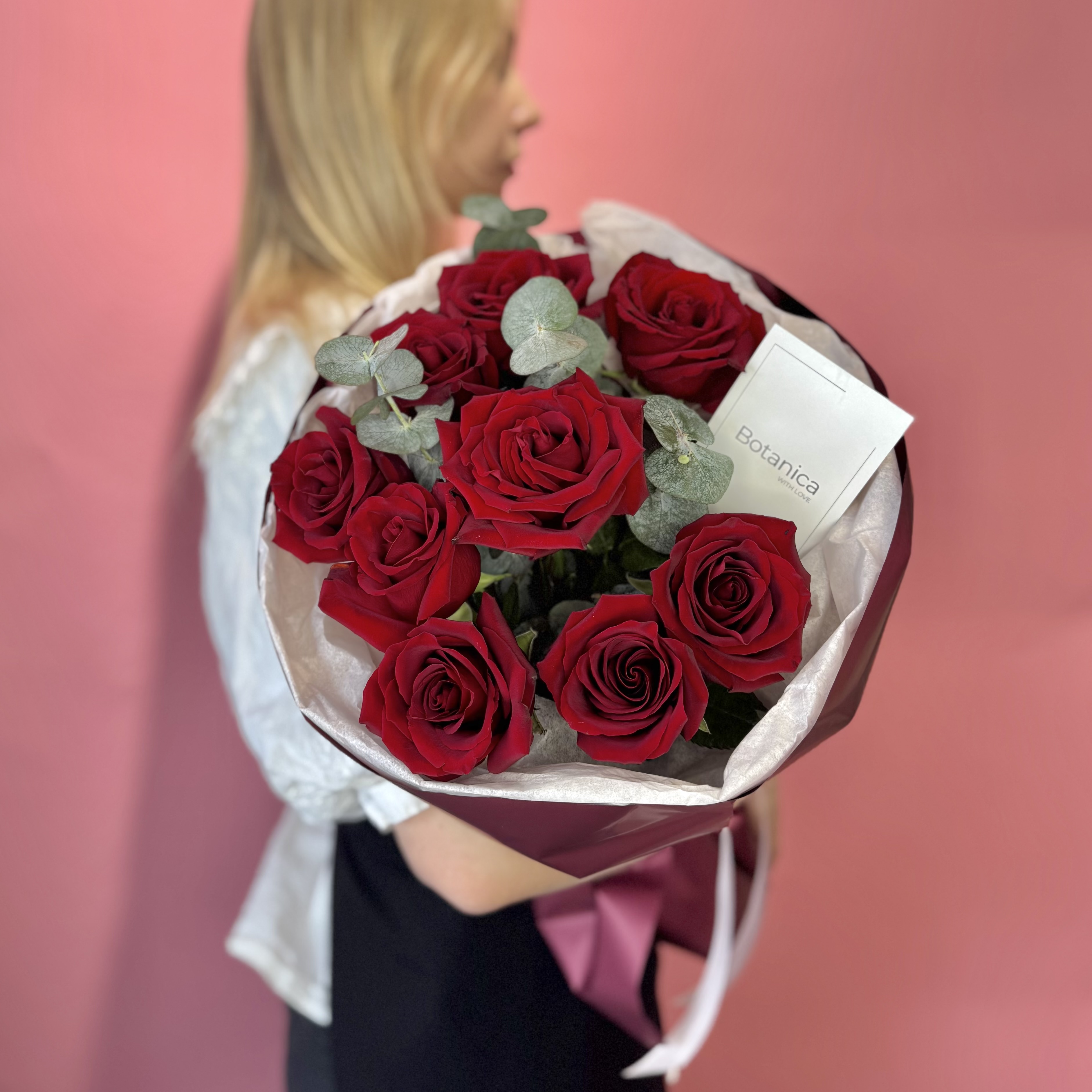 Розовая тишью, темно-красная пленка, розовая лента. Эксплорер 9, эвкалипт 1 банч