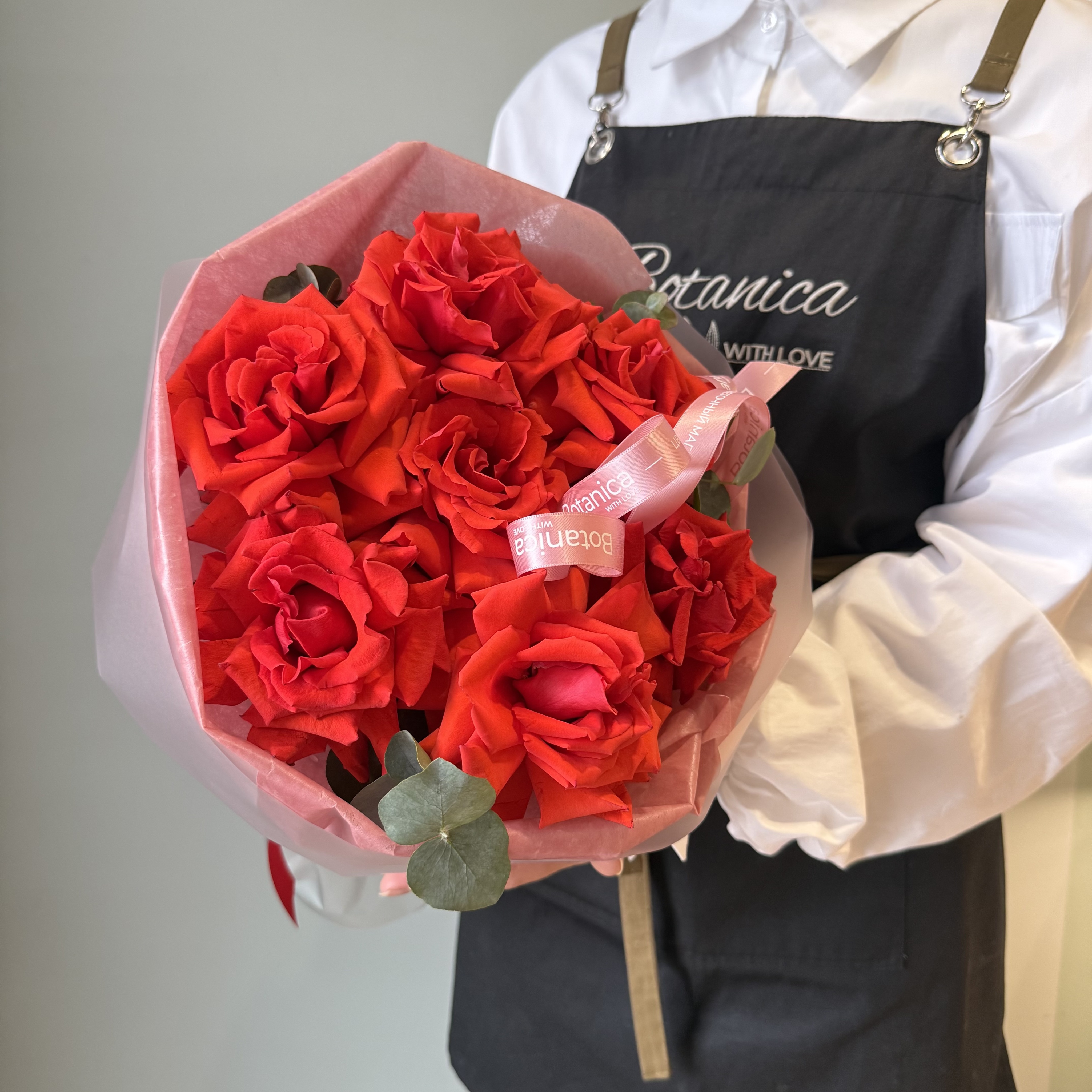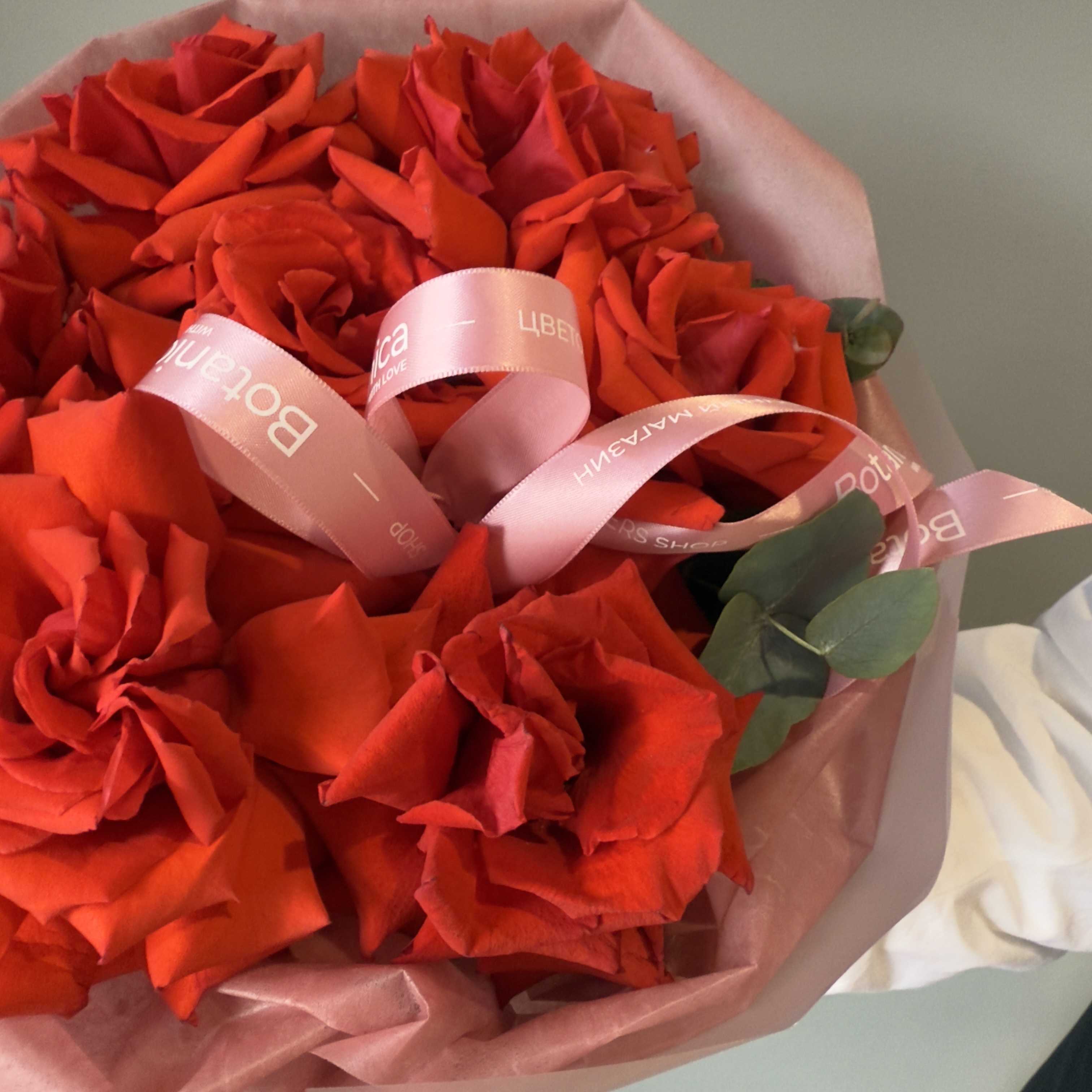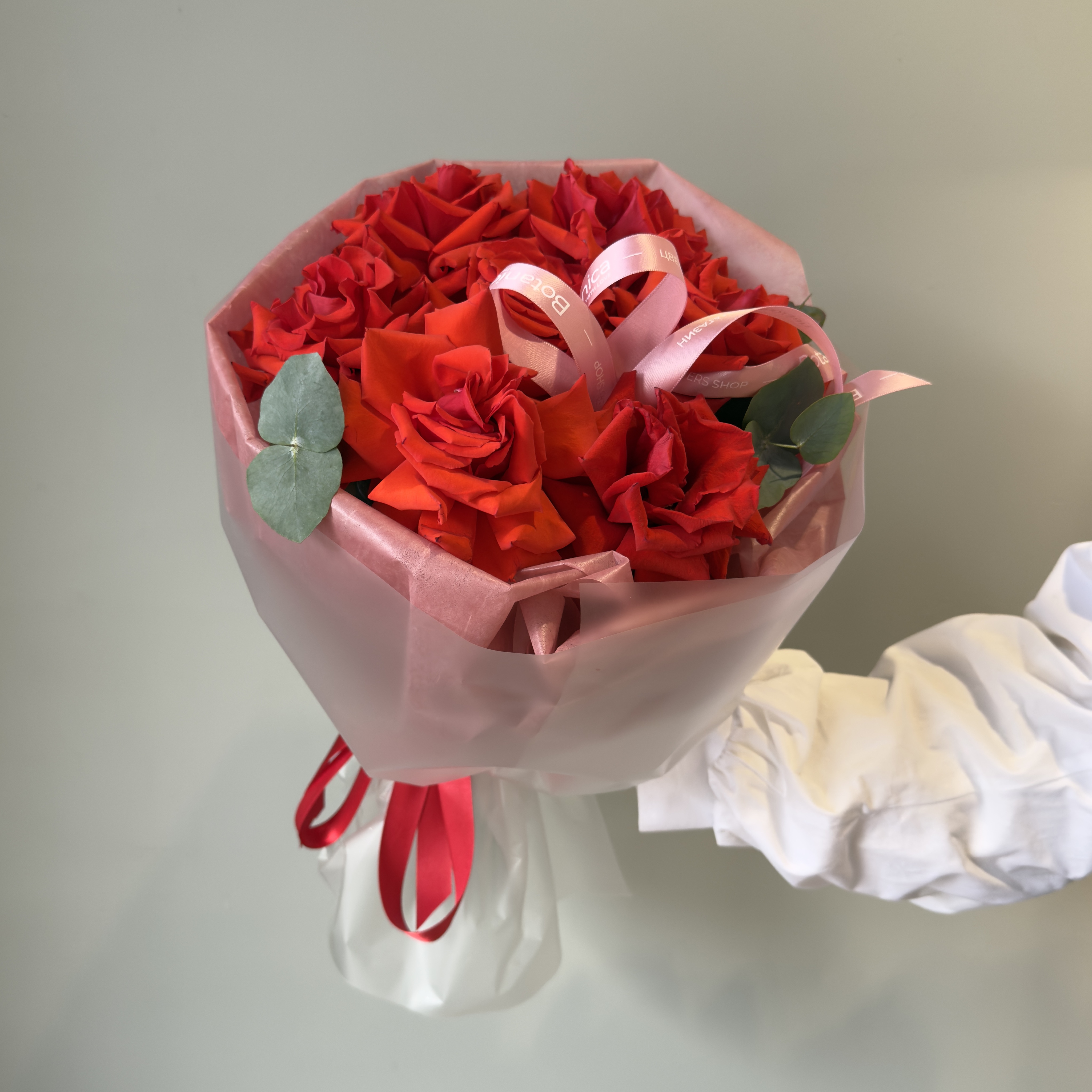 Темно - розовая тишью, матовая пленка.Французская Нина 7 шт, эвкалипт 1 банч