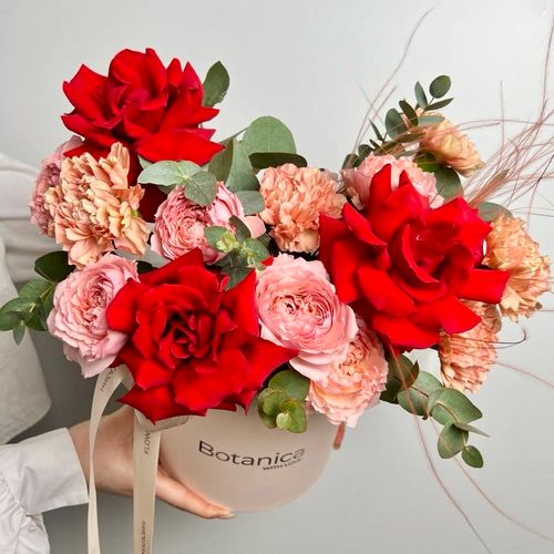 Шляпная коробка с эустомой и эвкалиптом 1303