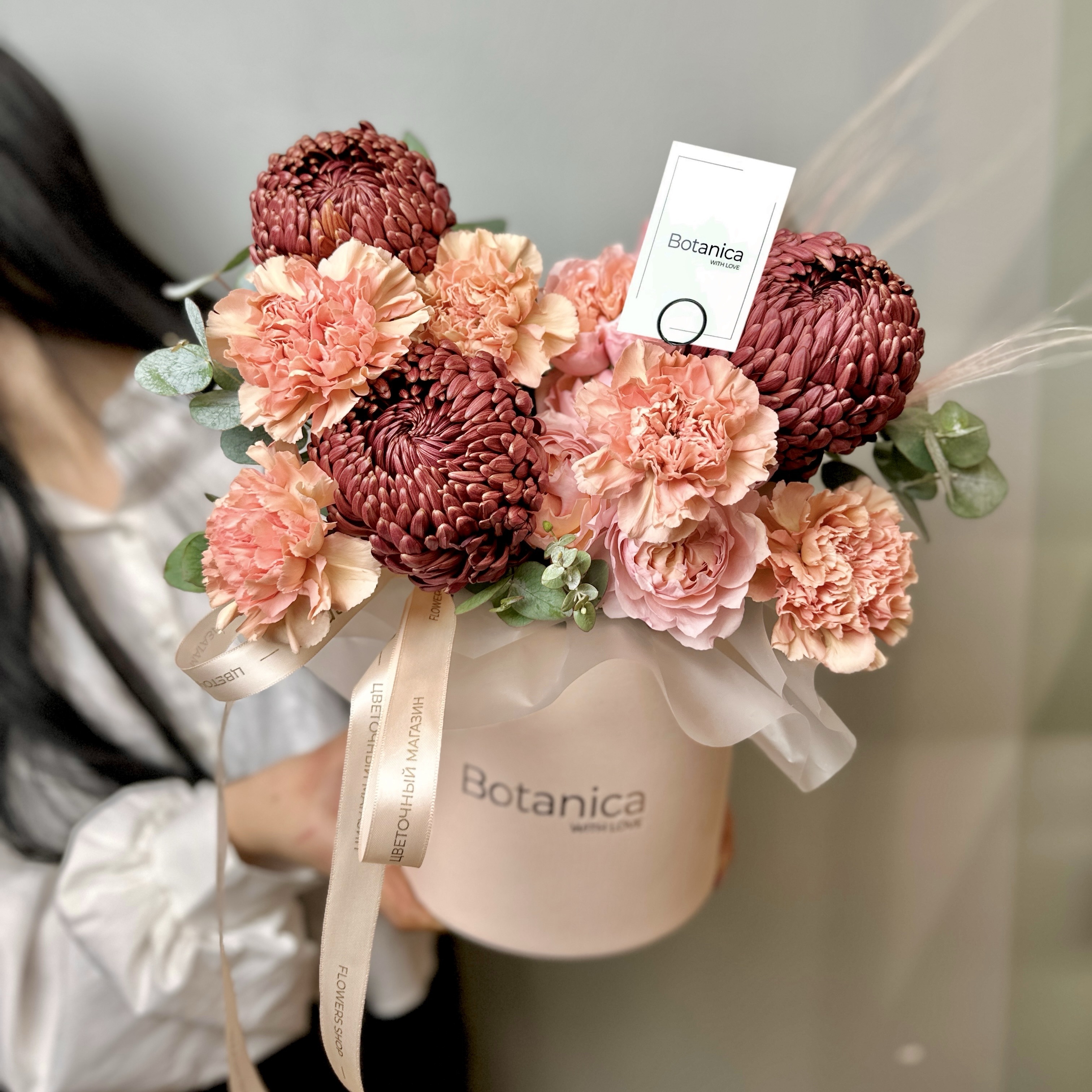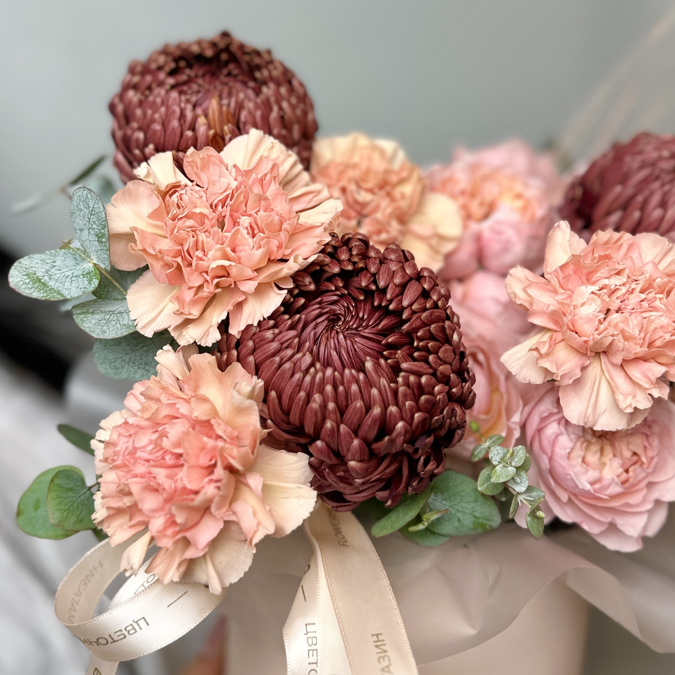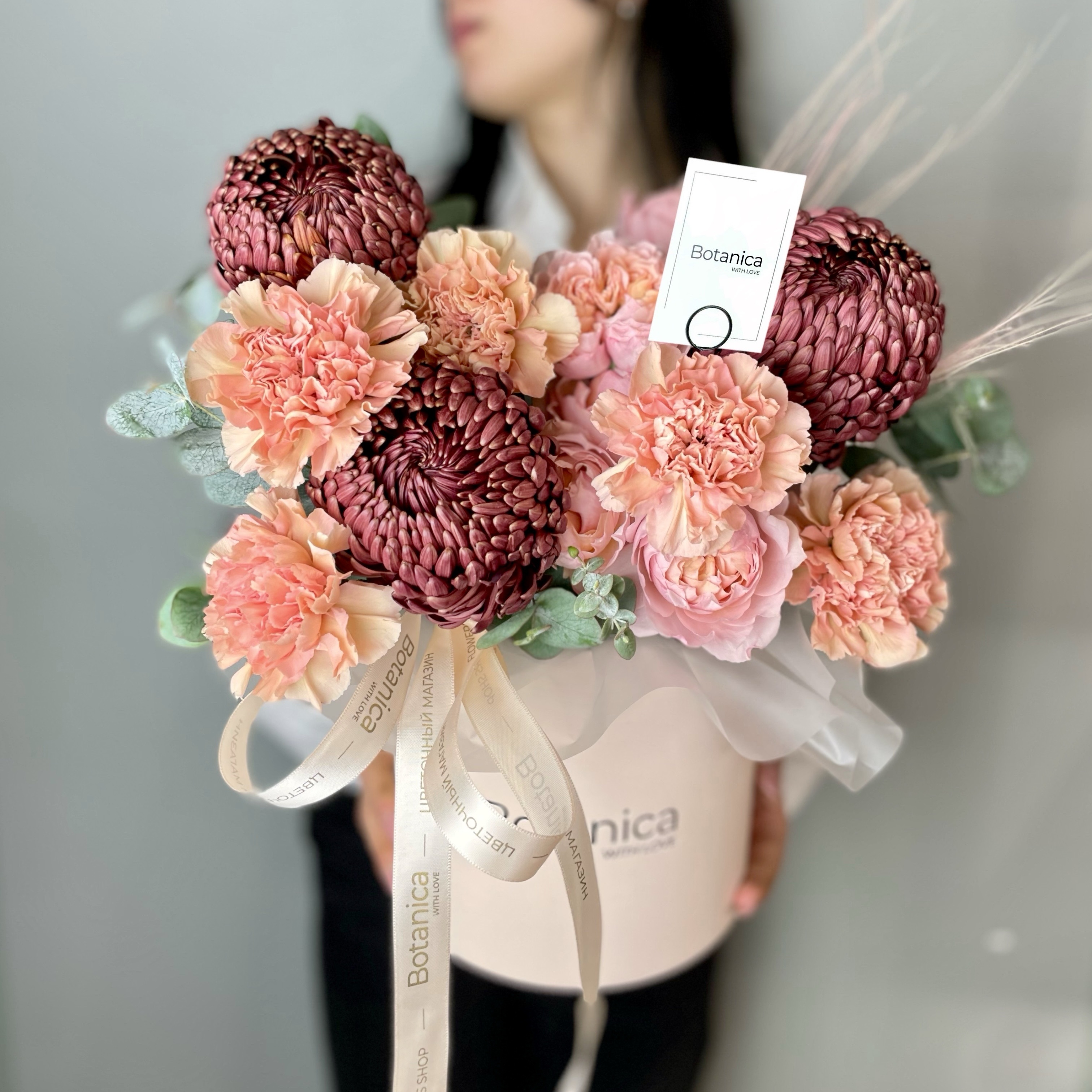 В нежной шляпной коробке — собрана воздушная и гармоничная цветочная композиция. Центром внимания становятся хризантемы сорта Бигуди — крупные, пышные, с оригинальными загнутыми лепестками, будто закрученными локонами. Их форма придаёт всей композиции фактурность и лёгкую игривость. Вокруг них распускаются кустовые пионовидные розы «Джульетта» — это нежнейшие розы теплого персиково-розового оттенка с густыми бархатными лепестками. Они придают композиции романтичность, глубину и ощущение роскоши. Дополняют композицию зеленые акценты — придающие свежесть и контраст.