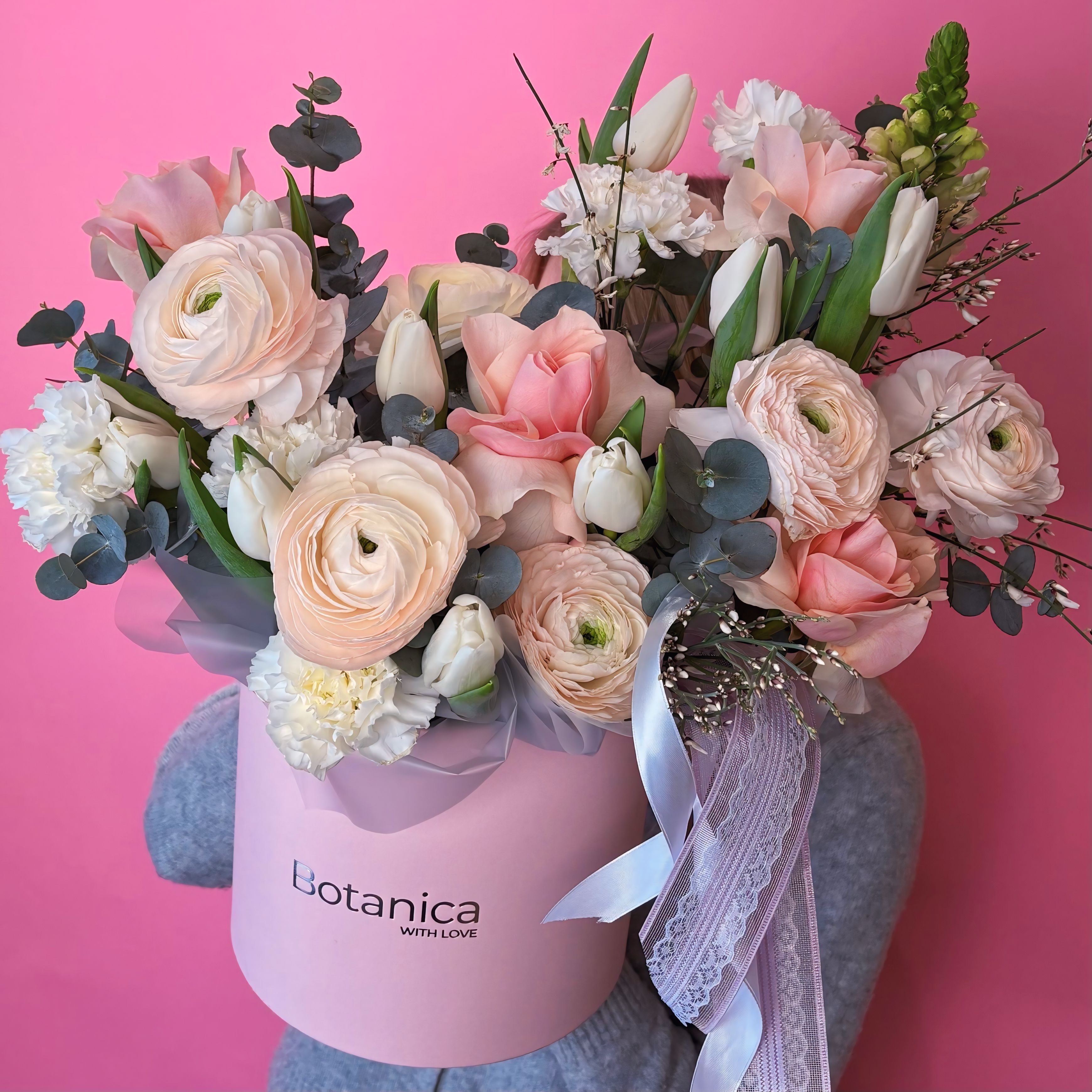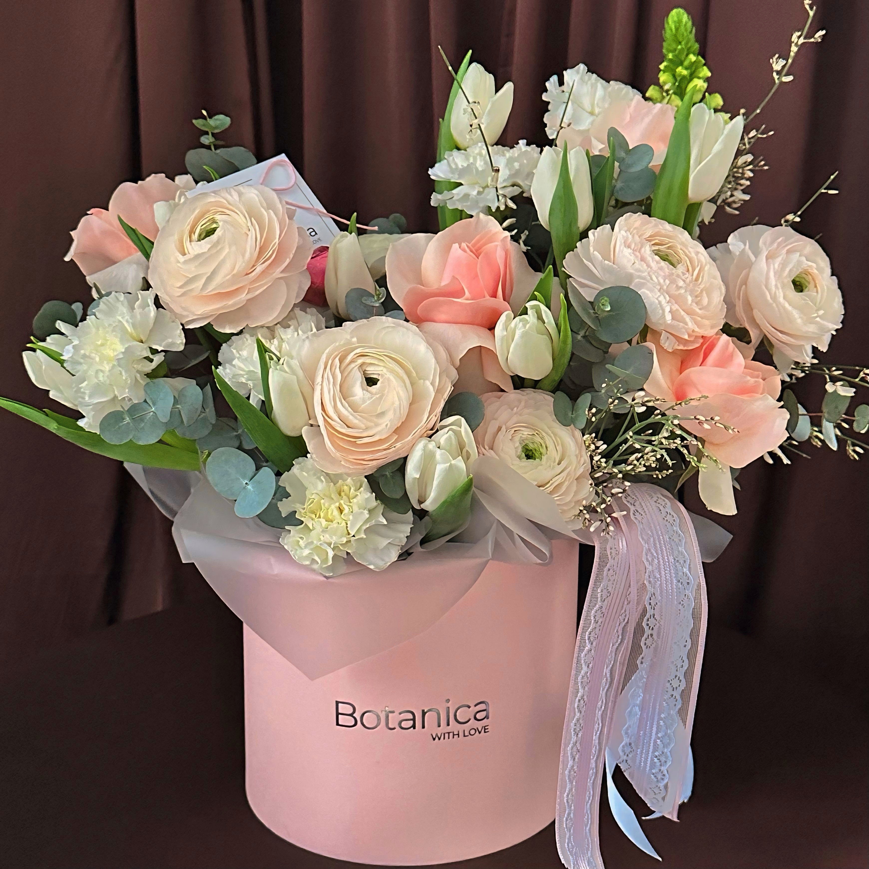 Цветочная композиция с тюльпанами и ранункулюсами — нежное и гармоничное сочетание весенних цветов. Элегантные тюльпаны придают композиции лёгкость и свежесть, а пышные ранункулюсы добавляют объём и изысканную текстуру.