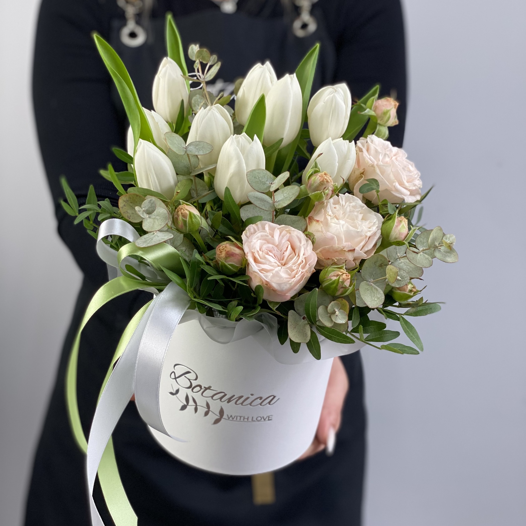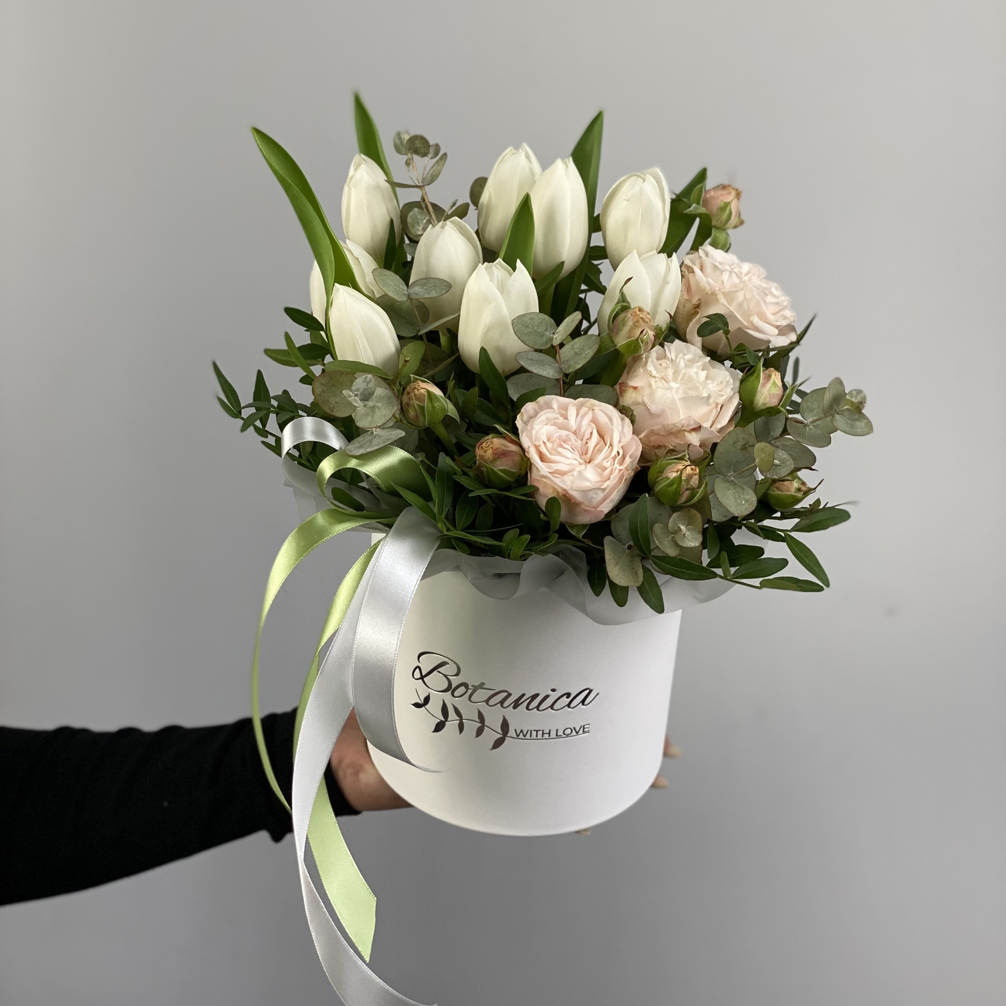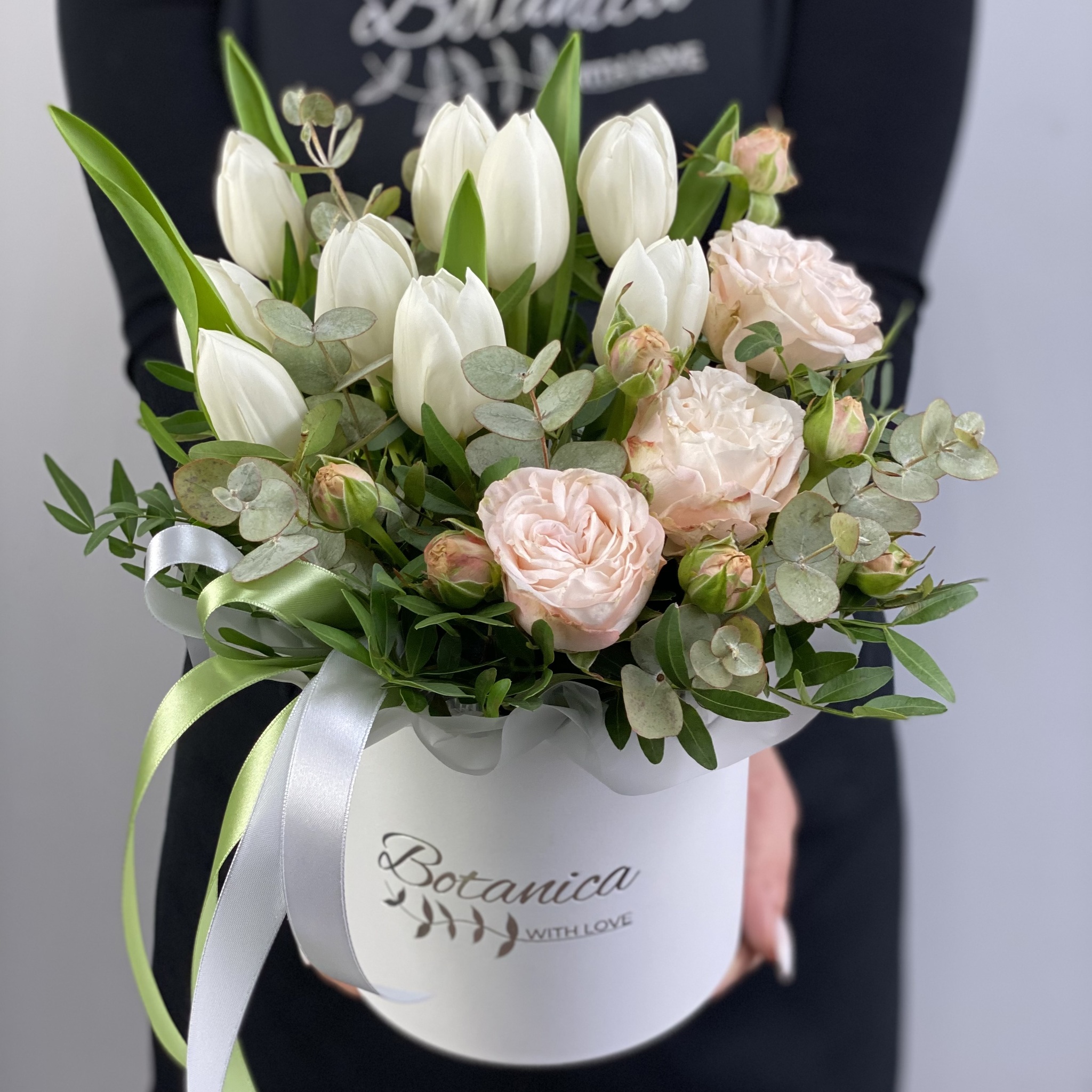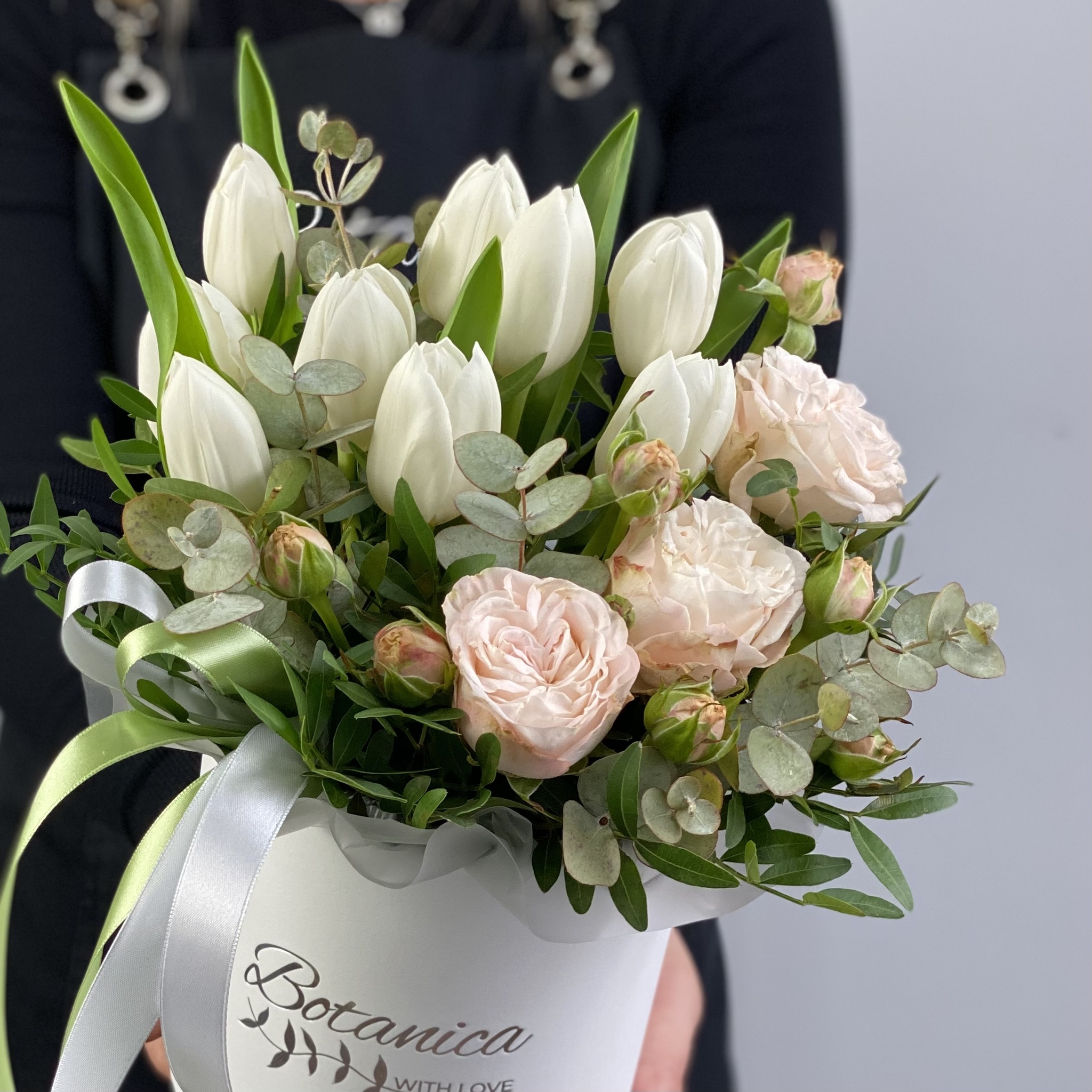 Состав:тюльпаны, кустовая Роза, эвкалипт, писташь, коробка, оазис.