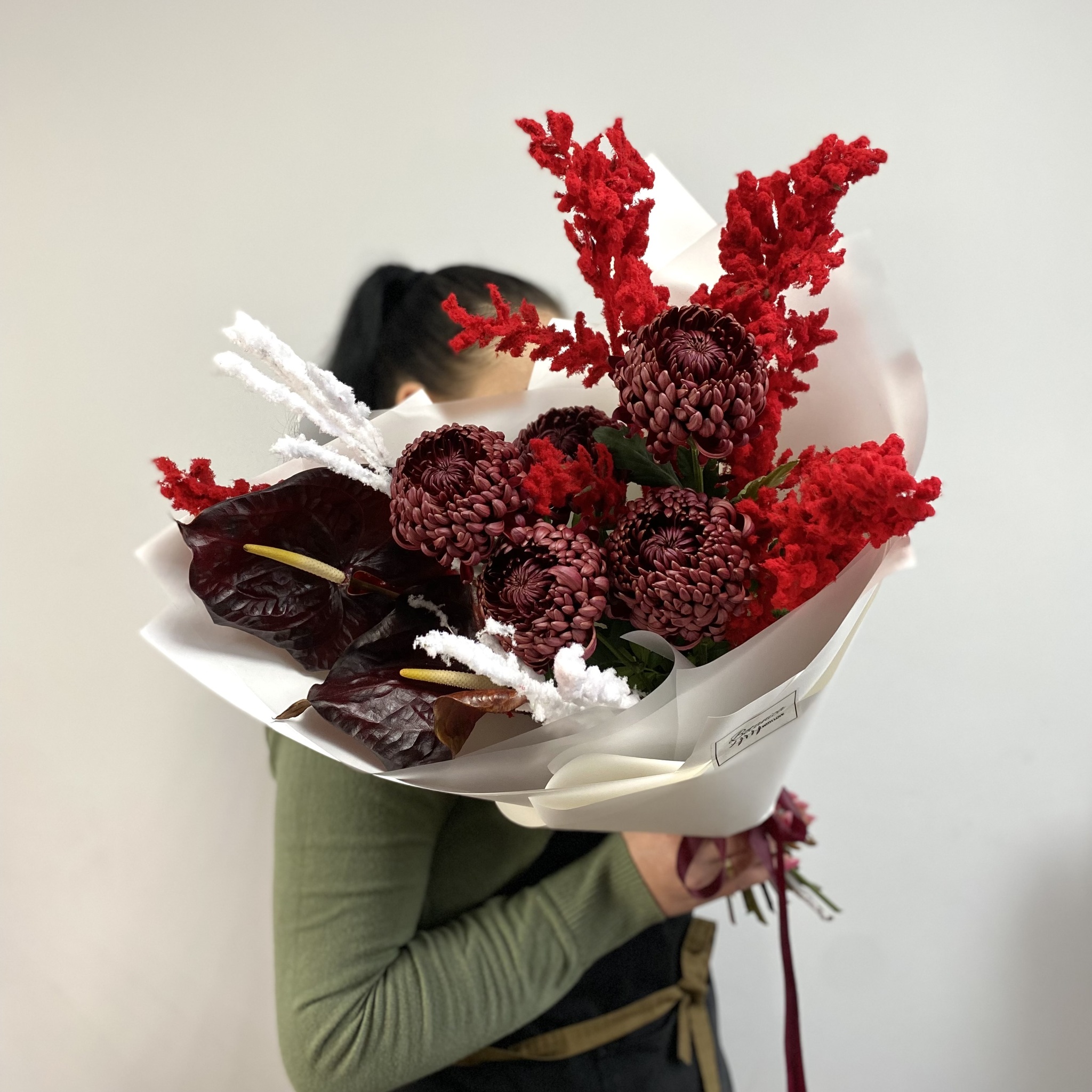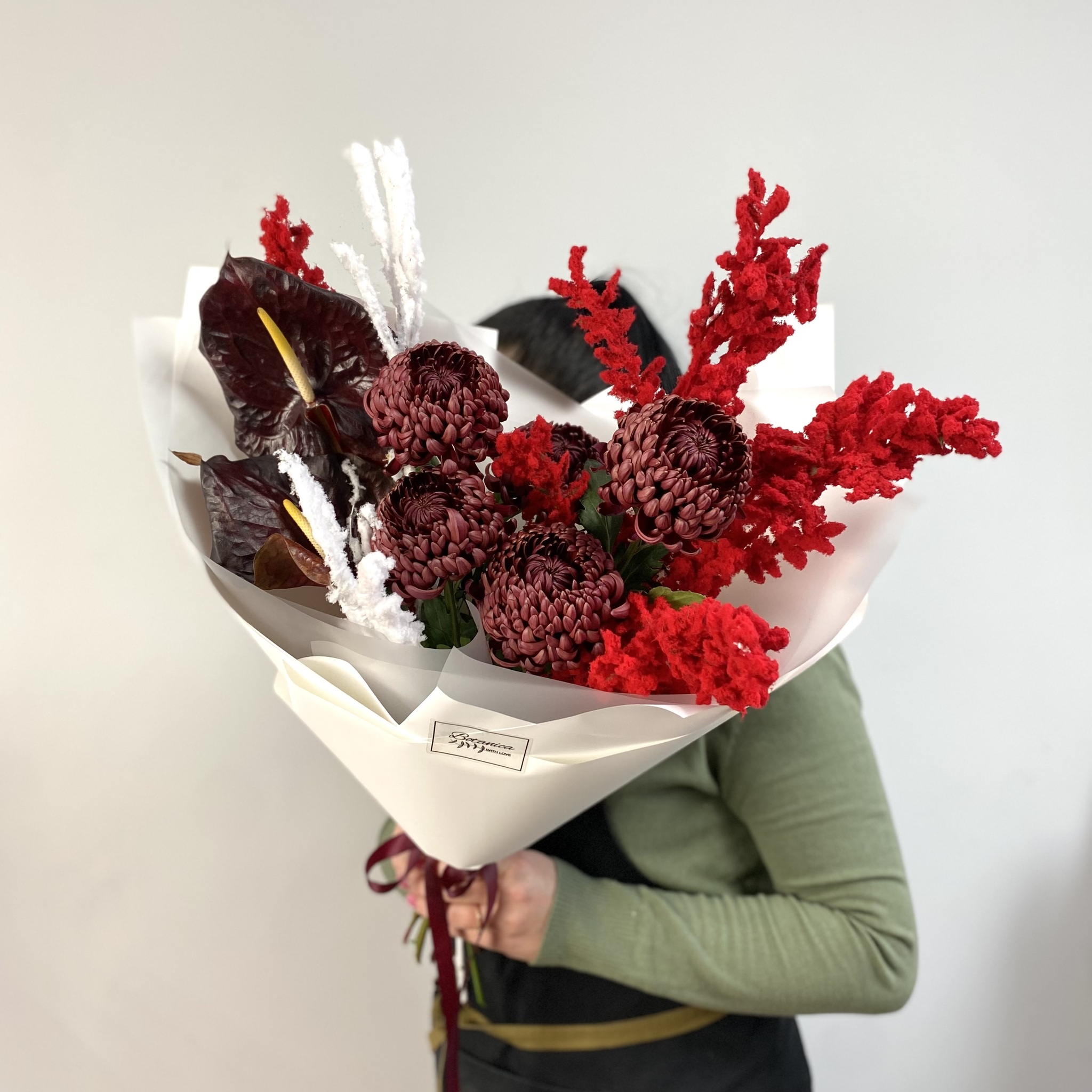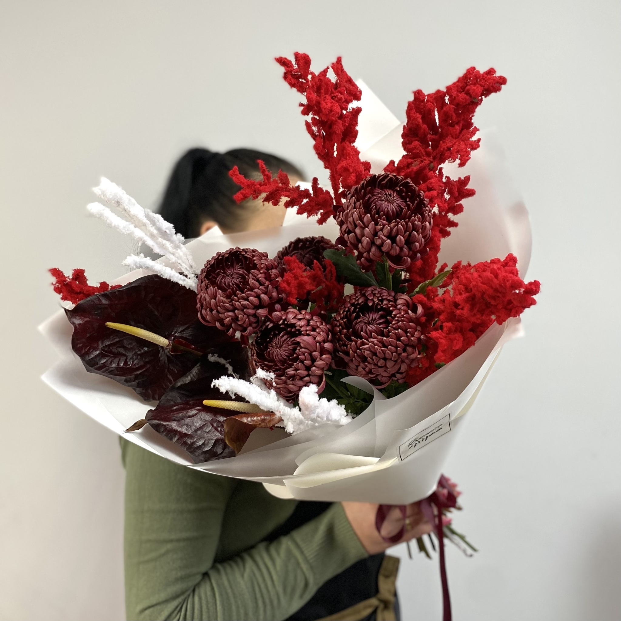Состав: антуриум, «Бигуди», рускус заснеженный красный, ветки заснеженные белые, упаковка