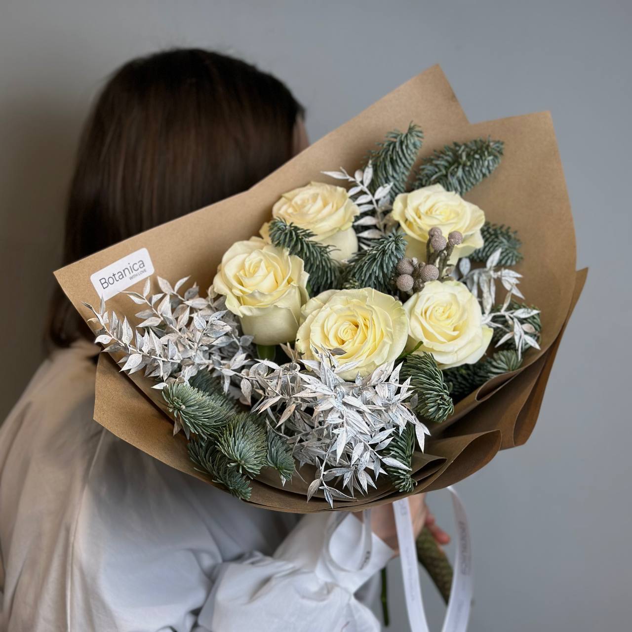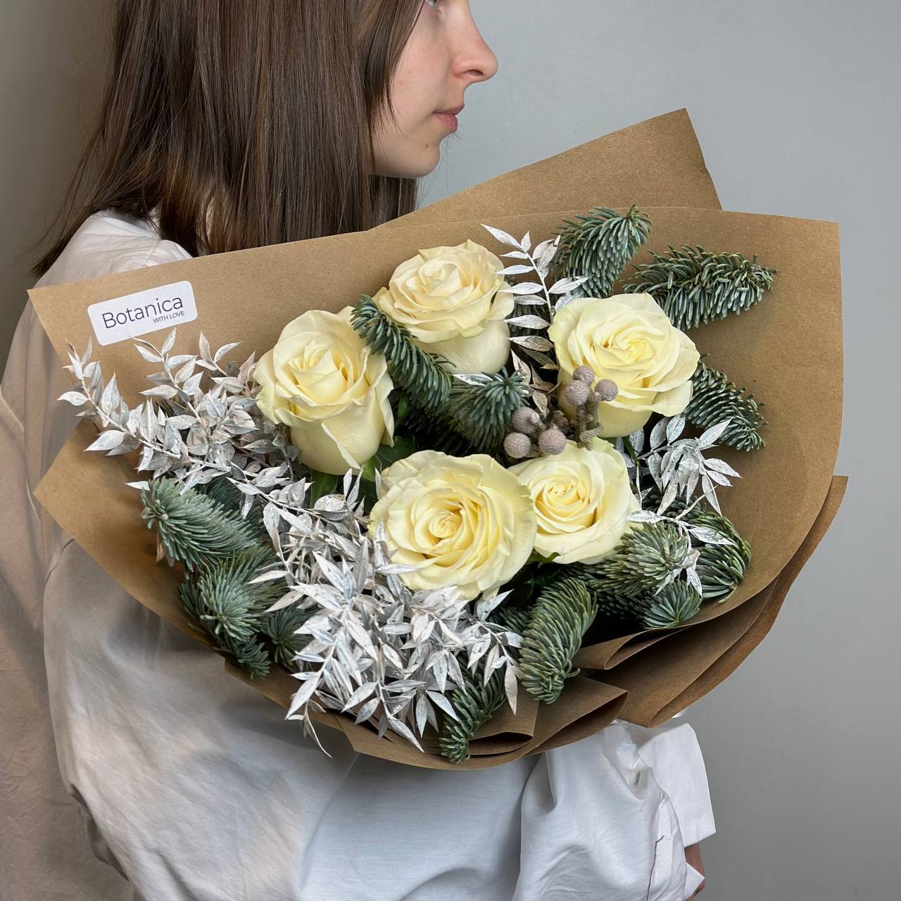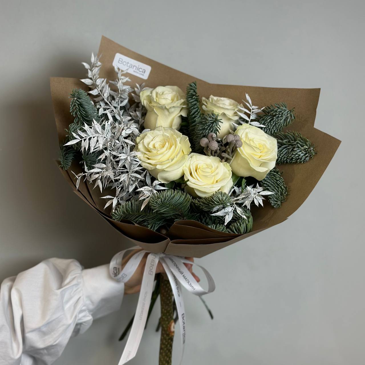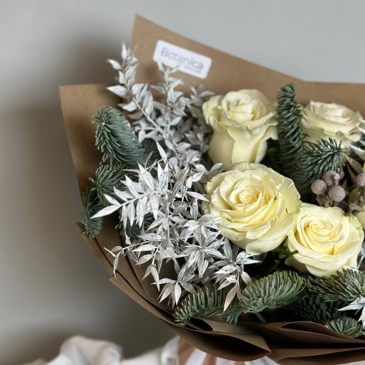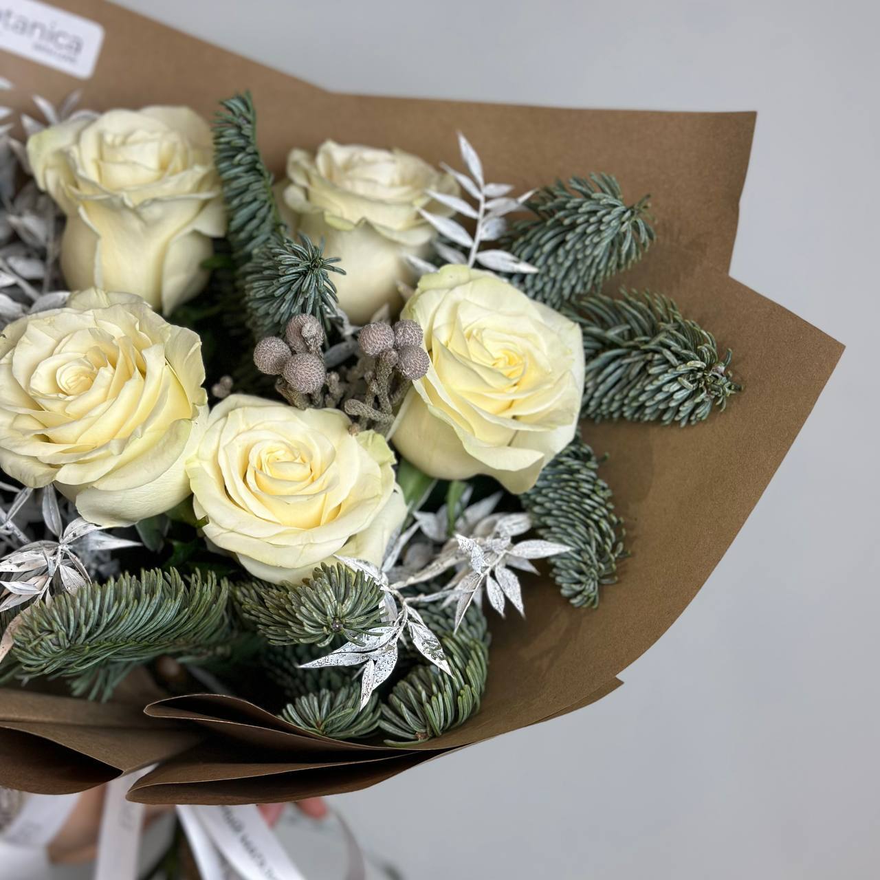 Зимний букет с белыми розами и нобилисом. Букет 1220